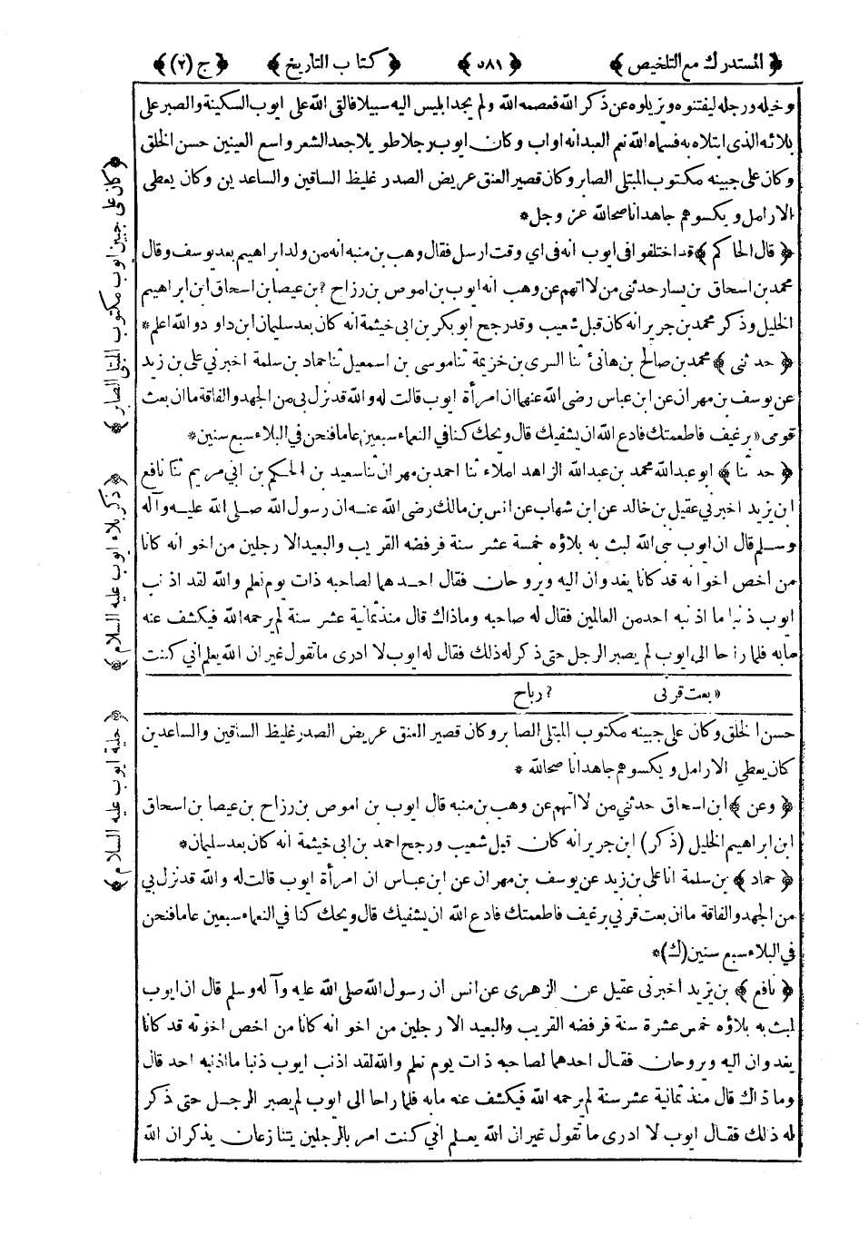 4115- حَدَّثَنَا أَبُو عَبْدِ اللهِ مُحَمَّدُ بْنُ عَبْدِ اللهِ الزَّاهِدُ إِمْلاَءً ، حَدَّثَنَا أَحْمَدُ بْنُ مِهْرَانَ ، حَدَّثَنَا شُعَيْبُ بْنُ الْحَكَمِ بْنِ أَبِي مَرْيَمَ ، حَدَّثَنَا نَافِعُ بْنُ يَزِيدَ ، أَخْبَرَنِي عُقَيْلُ بْنُ خَالِدٍ ، عَنِ ابْنِ شِهَابٍ ، عَنْ أَنَسِ بْنِ مَالِكٍ رَضِيَ اللَّهُ عَنْهُ ، أَنَّ رَسُولَ اللهِ صَلَّى اللَّهُ عَلَيْهِ وَسَلَّمَ ، قَالَ : إِنَّ أَيُّوبَ نَبِيَّ اللهِ لَبِثَ بِهِ بَلاَؤُهُ خَمْسَ عَشْرَةَ سَنَةً فَرَفَضَهُ الْقَرِيبُ وَالْبَعِيدُ إِلاَّ رَجُلَيْنِ مِنْ إِخْوَانِهِ كَانَا مِنْ أَخَصِّ إِخْوَانِهِ ، قَدْ كَانَا يَغْدُوَانِ إِلَيْهِ وَيَرُوحَانَ ، فَقَالَ أَحَدُهُمَا لِصَاحِبِهِ ذَاتَ يَوْمٍ : نَعْلَمُ وَاللَّهِ لَقَدْ أَذْنَبَ أَيُّوبُ ذَنْبًا مَا أَذْنَبَهُ أَحَدٌ مِنَ الْعَالَمِينَ فَقَالَ لَهُ صَاحِبُهُ : وَمَا ذَاكَ ؟ قَالَ : مُنْذُ ثَمَانِيَ عَشْرَةَ سَنَةً لَمْ يَرْحَمْهُ اللَّهُ فَكَشَفَ عَنْهُ مَا بِهِ فَلَمَّا رَاحًا إِلَى أَيُّوبَ لَمْ يَصْبِرِ الرَّجُلُ حَتَّى ذَكَرَ لَهُ ذَلِكَ ، فَقَالَ لَهُ أَيُّوبُ : لاَ أَدْرِي مَا تَقُولُ غَيْرَ أَنَّ اللَّهَ يَعْلَمُ أَنِّي كُنْتُ أَمُرُّ بِالرَّجُلَيْنِ يَتَنَازَعَانِ يَذْكُرَانِ اللَّهَ فَأَرْجِعُ إِلَى بَيْتِي ، فَأُكَفِّرُ عَنْهُمَا كَرَاهِيَةَ أَنْ يُذْكَرَ اللَّهُ إِلاَّ فِي حَقٍّ ، وَكَانَ يَخْرُجُ لِحَاجَتِهِ ، فَإِذَا قَضَى حَاجَتَهُ أَمْسَكَتِ امْرَأَتُهُ بِيَدِهِ حَتَّى يَبْلُغَ ، فَلَمَّا كَانَ ذَاتَ يَوْمٍ أَبْطَأَ عَلَيْهَا فَأَوْحَى اللَّهُ إِلَى أَيُّوبَ فِي مَكَانِهِ أَنِ ارْكُضْ بِرِجْلِكَ هَذَا مُغْتَسَلٌ بَارِدٌ وَشَرَابٌ ، فَاسْتَبْطَأَتْهُ فَتَلَقَّتْهُ وَأَقْبَلَ عَلَيْهَا قَدْ أَذْهَبَ اللَّهُ مَا بِهِ مِنَ الْبَلاَءِ وَهُوَ أَحْسَنُ مَا كَانَ ، فَلَمَّا رَأَتْهُ قَالَتْ : أَيْ بَارَكَ اللَّهُ فِيكَ هَلْ رَأَيْتَ نَبِيَّ اللهِ هَذَا الْمُبْتَلَى ؟ وَاللَّهِ عَلَى ذَلِكَ مَا رَأَيْتُ رَجُلاً أَشْبَهَ بِهِ مِنْكَ إِذْ كَانَ صَحِيحًا ، قَالَ : فَإِنِّي أَنَا هُوَ ، قَالَ : وَكَانَ لَهُ أَنْدَرَانِ أَنْدَرٌ لِلْقَمْحِ وأَنْدَرٌ لِلشَّعِيرِ ، فَبَعَثَ اللَّهُ سَحَابَتَيْنِ ، فَلَمَّا كَانَتْ أَحَدُهُمَا عَلَى أَنْدَرِ الْقَمْحِ أَفْرَغَتْ فِيهِ الذَّهَبَ حَتَّى فَاضَ وَأَفْرَغَتِ الآُخْرَى فِي أَنْدَرِ الشَّعِيرِ الْوَرِقَ حَتَّى فَاضَ.