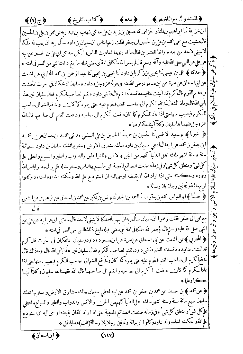 4139- أَخْبَرَنَا أَبُو سَعِيدٍ الأَحْمَسِيُّ ، حَدَّثَنَا الْحُسَيْنُ بْنُ حُمَيْدٍ ، حَدَّثَنَا الْحُسَيْنُ بْنُ عَلِيٍّ السُّلَمِيُّ ، حَدَّثَنِي مُحَمَّدُ بْنُ حَسَّانَ ، عَنْ مُحَمَّدِ بْنِ جَعْفَرِ بْنِ مُحَمَّدٍ ، عَنْ أَبِيهِ ، قَالَ : أُعْطِيَ سُلَيْمَانُ بْنُ دَاوُدَ مُلْكَ مَشَارِقِ الأَرْضِ وَمَغَارِبِهَا فَمَلَكَ سُلَيْمَانُ بْنُ دَاوُدَ سَبْعمِائَةَ سَنَةٍ وَسِتَّةَ أَشْهُرٍ مَلَكَ أَهْلَ الدُّنْيَا كُلَّهُمْ مِنَ الْجِنِّ وَالإِنْسِ وَالشَّيَاطِينِ وَالدَّوَابِّ وَالطَّيْرِ وَالسِّبَاعِ ، وَأُعْطِي عِلْمَ كُلِّ شَيْءٍ ، وَمَنْطِقَ كُلِّ شَيْءٍ ، وَفِي زَمَانِهِ صُنِعَتِ الصَّنَائِعُ الْمُعْجِبَةُ الَّتِي مَا سَمِعَ بِهَا النَّاسُ ، وَسُخِّرَتْ لَهُ فَلَمْ يَزَلْ مُدَبِّرًا بِأَمْرِ اللهِ وَنُورِهِ وَحِكْمَتِهِ ، حَتَّى إِذَا أَرَادَ اللَّهُ أَنْ يَقْبِضَهُ أَوْحَى إِلَيْهِ أَنِ اسْتَوْدِعْ عِلْمَ اللهِ وَحِكْمَتَهُ أَخَاهُ وَوَلَدَ دَاوُدَ وَكَانُوا أَرْبَعَ مِائَةٍ وَثَمَانِينَ رَجُلاً بِلاَ رِسَالَةٍ.