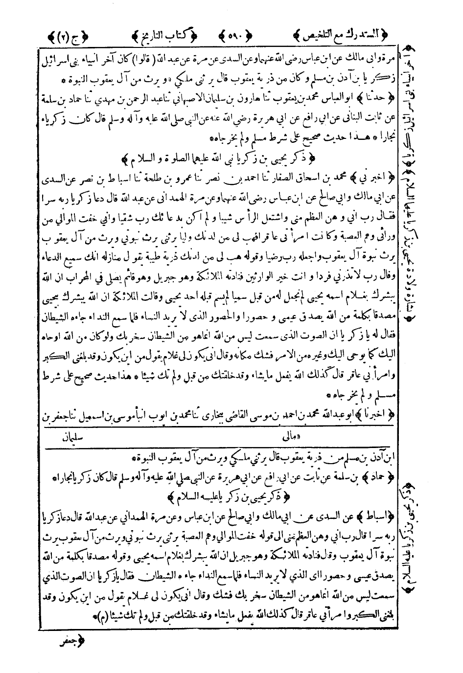 4146- أَخْبَرَنِي مُحَمَّدُ بْنُ إِسْحَاقَ الصَّفَّارُ ، حَدَّثَنَا أَحْمَدُ بْنُ نَصْرٍ ، حَدَّثَنَا عَمْرُو بْنُ طَلْحَةَ ، حَدَّثَنَا أَسْبَاطُ بْنُ نَصْرٍ ، عَنِ السُّدِّيِّ ، عَنْ أَبِي مَالِكٍ ، وَأَبِي صَالِحٍ عَنِ ابْنِ عَبَّاسٍ رَضِيَ اللَّهُ عَنْهُمَا ، وَعَنْ مُرَّةَ الْهَمْدَانِيِّ ، عَنْ عَبْدِ اللهِ ، قَالَ : دَعَا زَكَرِيَّا رَبَّهُ سِرًّا فَقَالَ : رَبِّ إِنِّي وَهَنَ الْعَظْمُ مِنِّي ، وَاشْتَعَلَ الرَّأْسُ شَيْبًا ، وَلَمْ أَكُنْ بِدُعَائِكَ رَبِّ شَقِيًّا وَإِنِّي خِفْتُ الْمَوَالِيَ مِنْ وَرَائِي ، وَهُمُ الْعَصَبَةُ وَكَانَتِ امْرَأَتِي عَاقِرًا فَهَبْ لِي مِنْ لَدُنْكَ وَلِيًّا يَرِثُنِي ، ويَرِثُ نُبُوَّتِي وَيَرِثُ مِنْ آلِ يَعْقُوبَ يَرِثُ نُبُوَّةَ آلِ يَعْقُوبِ وَاجْعَلْهُ رَبِّ رَضِيًّا ، وَقَوْلُهُ : هَبْ لِي مِنْ لَدُنْكَ ذُرِّيَّةً طَيِّبَةً ، يَقُولُ مَنَازِلُهُ : إِنَّكَ سُمَيْعُ الدُّعَاءِ وَقَالَ : رَبِّ لاَ تَذَرْنِي فَرْدًا وَأَنْتَ خَيْرُ الْوَارِثِينَ ، فَنَادَتْهُ الْمَلاَئِكَةُ وَهُوَ جِبْرِيلُ ، وَهُوَ قَائِمٌ يُصَلِّي فِي الْمِحْرَابِ أَنَّ اللَّهَ يُبَشِّرُكَ بِغُلاَمٍ اسْمُهُ يَحْيَى لَمْ نَجْعَلْ لَهُ مِنْ قَبْلُ سَمِيًّا لَمْ يُسَمَّ قَبْلَهُ أَحَدٌ يَحْيَى وَقَالَتِ الْمَلاَئِكَةُ : إِنَّ اللَّهَ يُبَشِّرُكَ بِيَحْيَى مُصَدِّقًا بِكَلِمَةٍ مِنَ اللهِ يُصَدِّقُ عِيسَى وَحَصُورًا ، وَالْحَصُورُ : الَّذِي لاَ يُرِيدُ النِّسَاءَ فَلَمَّا سَمِعَ النِّدَاءَ جَاءَهُ الشَّيْطَانُ فَقَالَ لَهُ : يَا زَكَرِيَّا إِنَّ الصَّوْتَ الَّذِي سَمِعْتَ لَيْسَ مِنَ اللهِ إِنَّمَا هُوَ مِنَ الشَّيْطَانِ سَخِرَ بِكَ وَلَوْ كَانَ مِنَ اللهِ أَوْحَاهُ إِلَيْكَ كَمَا يُوحِي إِلَيْكَ غَيْرَهُ مِنَ الأَمْرِ فَشَكَّ مَكَانَهُ وَقَالَ : أَنَّى يَكُونُ لِي غُلاَمٌ يَقُولُ مِنْ أَيْنَ يَكُونُ وَقَدْ بَلَغَنِيَ الْكِبْرُ وَامْرَأَتِي عَاقِرٌ قَالَ : كَذَلِكَ اللَّهُ يَفْعَلُ مَا يَشَاءَ وَقَدْ خَلَقْتُكَ مِنْ قَبْلُ وَلَمْ تَكُ شَيْئًا.