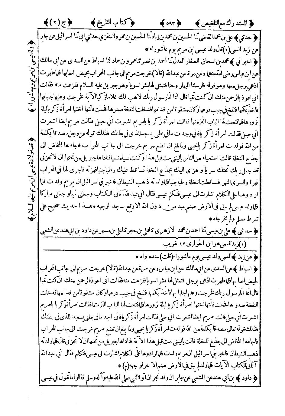 4156- أَخْبَرَنِي مُحَمَّدُ بْنُ إِسْحَاقَ الصَّفَّارُ الْعَدْلُ ، حَدَّثَنَا أَحْمَدُ بْنُ نَصْرٍ ، حَدَّثَنَا عَمْرُو بْنُ حَمَّادٍ ، حَدَّثَنَا أَسْبَاطٌ ، عَنِ السُّدِّيِّ ، عَنْ أَبِي مَالِكٍ ، عَنِ ابْنِ عَبَّاسٍ رَضِيَ اللَّهُ عَنْهُمَا ، وَعَنْ مُرَّةَ ، عَنْ عَبْدِ اللهِ ، قَالاَ : خَرَجَتْ مَرْيَمُ إِلَى جَانِبِ الْمِحْرَابِ بِحَيْضٍ أَصَابَهَا فَلَمَّا طَهُرَتْ إِذْ هِيَ بِرَجُلٍ مَعَهَا وَهُوَ قَوْلُهُ : {فَأَرْسَلْنَا إِلَيْهَا رُوحَنَا فَتَمَثَّلَ لَهَا بَشَرًا سَوِيًّا} ، وَهُوَ جِبْرِيلُ عَلَيْهِ السَّلاَمُ فَفَزِعَتْ مِنْهُ فَقَالَتْ : {إِنِّي أَعُوذُ بِالرَّحْمَنِ مِنْكَ إِنْ كُنْتَ تَقِيًّا} قَالَ : {إِنَّمَا أَنَا رَسُولُ رَبِّكِ لأَهَبَ لَكِ غُلاَمًا زَكِيًّا} الآيَةُ ، فَخَرَجَتْ وَعَلَيْهَا جِلْبَابُهَا فَأَخَذَ بِكُمِّهَا فَنَفَخَ فِي جَيْبِ دِرْعِهَا وَكَانَ مَشْقُوقًا مِنْ قُدَّامِهَا فَدَخَلَتِ النَّفْخَةُ صَدْرَهَا فَحَمَلَتْ فَأَتَتْهَا أُخْتُهَا امْرَأَةُ زَكَرِيَّا لَيْلَةً تَزُورُهَا فَلَمَّا فَتَحَتْ لَهَا الْبَابَ الْتَزَمَتْهَا فَقَالَتِ امْرَأَةُ زَكَرِيَّا : يَا مَرْيَمُ أَشَعَرْتِ أَنِّي حُبْلَى ؟ فَقَالَتْ مَرْيَمُ أَيْضًا : أَشَعَرْتِ أَنِّي حُبْلَى ، فَقَالَتِ امْرَأَةُ زَكَرِيَّا : فَإِنِّي وَجَدْتُ مَا فِي بَطْنِي يَسْجُدُ لِلَّذِي فِي بَطْنِكِ فَذَلِكَ قَوْلُهُ عَزَّ وَجَلَّ : {مُصَدِّقًا بِكَلِمَةٍ مِنَ اللَّهِ} فَوَلَدَتِ امْرَأَةُ زَكَرِيَّا يَحْيَى وَلَمَّا بَلَغَ أَنْ تَضَعَ مَرْيَمُ خَرَجَتْ إِلَى جَانِبِ الْمِحْرَابِ فَأَجَاءَهَا الْمَخَاضُ إِلَى جِذْعِ النَّخْلَةِ قَالَتِ اسْتِحْيَاءً مِنَ النَّاسِ : {يَا لَيْتَنِي مِتُّ قَبْلَ هَذَا وَكُنْتُ نَسِيًّا مَنْسِيًّا} فَنَادَاهَا جِبْرِيلُ {مِنْ تَحْتِهَا أَلاَّ تَحْزَنِي قَدْ جَعَلَ رَبُّكِ تَحْتَكِ سَرِيًّا وَهُزِّي إِلَيْكِ بِجِذْعِ النَّخْلَةِ تُسَاقِطْ عَلَيْكِ رُطَبًا جَنِيًّا} فَهَزَّتْهُ فَأَجْرَى لَهَا فِي الْمِحْرَابِ نَهْرًا وَالسَّرِيُّ : النَّهَرُ فَتَسَاقَطَتِ النَّخْلَةُ رُطَبًا جَنِيًّا فَلَمَّا وَلَدَتْهُ ذَهَبَ الشَّيْطَانُ فَأَخْبَرَ بَنِي إِسْرَائِيلَ أَنَّ مَرْيَمَ وَلَدَتْ فَلَمَّا أَرَادُوهَا عَلَى الْكَلاَمِ أَشَارَتْ إِلَى عِيسَى فَتَكَلَّمَ عِيسَى فَقَالَ : إِنِّي عَبْدُ اللهِ آتَانِيَ الْكِتَابَ وَجَعَلَنِي نَبِيًّا وَجَعَلَنِي مُبَارَكًا فَلَمَّا وُلِدَ عِيسَى لَمْ يَبْقَ فِي الأَرْضِ صَنَمٌ يُعْبَدُ مِنْ دُونِ اللهِ إِلاَّ وَقَعَ سَاجِدًا لِوَجْهِهِ.