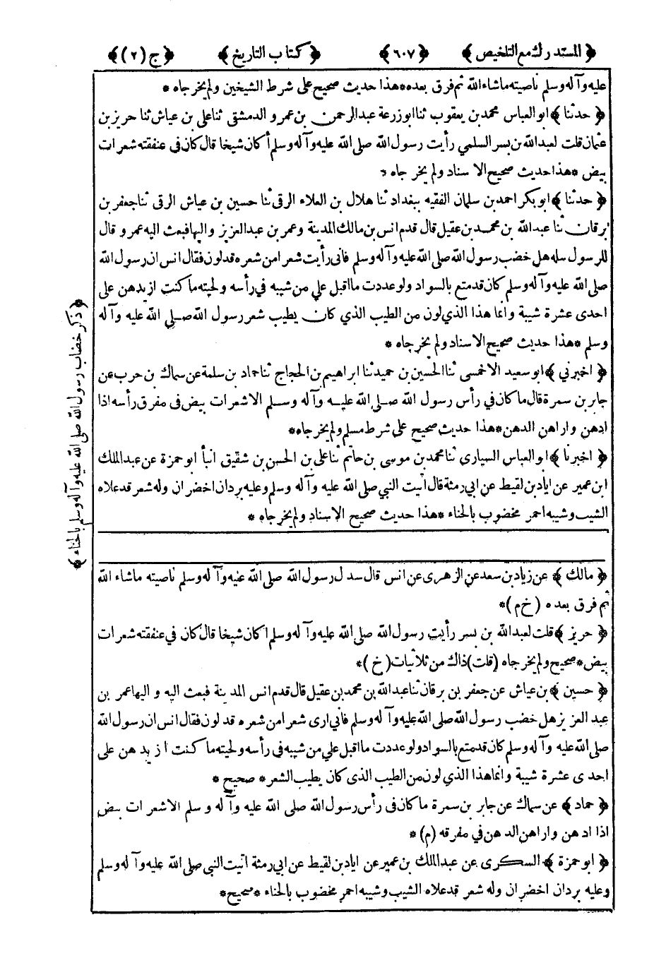 4201- حَدَّثَنَا أَبُو بَكْرٍ أَحْمَدُ بْنُ سَلْمَانَ الْفَقِيهُ بِبَغْدَادَ ، حَدَّثَنَا هِلاَلُ بْنُ الْعَلاَءِ الرَّقِّيُّ ، حَدَّثَنَا حُسَيْنُ بْنُ عَيَّاشٍ الرَّقِّيُّ ، حَدَّثَنَا جَعْفَرُ بْنُ بُرْقَانَ ، حَدَّثَنَا عَبْدُ اللهِ بْنُ مُحَمَّدِ بْنِ عَقِيلٍ ، قَالَ : قَدِمَ أَنَسُ بْنُ مَالِكٍ الْمَدِينَةَ وَعُمَرُ بْنُ عَبْدِ الْعَزِيزِ وَالِيهَا فَبَعَثَ إِلَيْهِ عُمَرُ وَقَالَ لِلرَّسُولِ : سَلْهُ هَلْ خَضَبَ رَسُولُ اللهِ صَلَّى اللَّهُ عَلَيْهِ وَسَلَّمَ ؟ فَإِنِّي رَأَيْتُ شَعْرًا مِنْ شَعْرِهِ قَدْ لُوِّنَ ، فَقَالَ أَنَسٌ : إِنَّ رَسُولَ اللهِ صَلَّى اللَّهُ عَلَيْهِ وَسَلَّمَ كَانَ قَدْ مُتِّعَ بِالسَّوَادِ وَلَوْ عَدَدْتُ مَا أَقْبَلَ عَلَيَّ مِنْ شَيْبِهِ فِي رَأْسِهِ وَلِحْيَتِهِ ، مَا كُنْتُ أَزِيدُهُنَّ عَلَى إِحْدَى عَشْرَةَ شَيْبَةً ، وَإِنَّمَا هَذَا الَّذِي لُوِّنَ مِنَ الطِّيبِ الَّذِي كَانَ يُطَيِّبُ شَعْرَ رَسُولِ اللهِ صَلَّى اللَّهُ عَلَيْهِ وَسَلَّمَ.