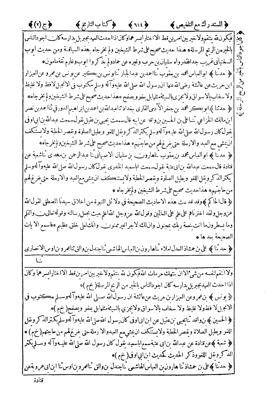 قَالَ الْحَاكِمُ : وَقَدْ قَدَّمْتُ هَذِهِ الأَحَادِيثَ الصَّحِيحَةَ فِي دَلاَئِلِ النُّبُوَّةِ مِنْ أَخْلاَقِ سَيِّدَنَا الْمُصْطَفَى لِقَوْلِ اللهِ عَزَّ وَجَلَّ : {وَلَقَدِ اخْتَرْنَاهُمْ عَلَى عِلْمٍ عَلَى الْعَالَمِينَ} وَقَوْلِ اللهِ عَزَّ وَجَلَّ : {اللَّهُ أَعْلَمُ حَيْثُ يَجْعَلُ رِسَالَتَهُ} وَقَوْلِهِ تَعَالَى : {ن وَالْقَلَمِ وَمَا يَسْطُرُونَ مَا أَنْتَ بِنِعْمَةِ رَبِّكِ بِمَجْنُونٍ وَإِنَّ لَكَ لاََجْرًا غَيْرَ مَمْنُونٍ وَإِنَّكَ لِعَلَى خُلُقٍ عَظِيمٍ} فَاسْمَعِ الآيَاتِ الصَّحِيحَةَ بَعْدَهَا.