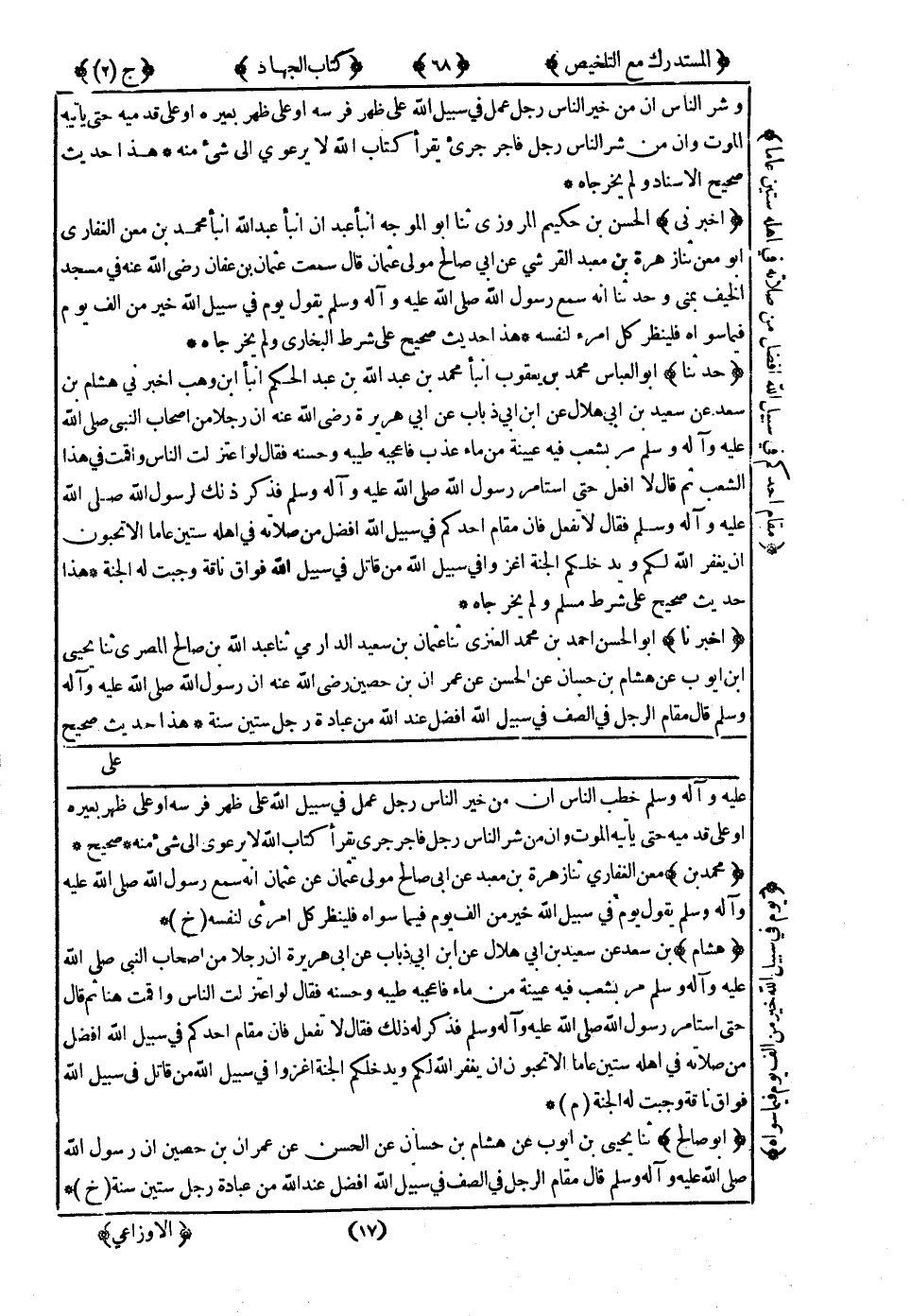 2383- أَخْبَرَنَا أَبُو الْحَسَنِ أَحْمَدُ بْنُ مُحَمَّدٍ الْعَنَزِيُّ ، حَدَّثَنَا عُثْمَانُ بْنُ سَعِيدٍ الدَّارِمِيُّ ، حَدَّثَنَا عَبْدُ اللهِ بْنُ صَالِحٍ الْمِصْرِيُّ ، حَدَّثَنَا يَحْيَى بْنُ أَيُّوبَ ، عَنْ هِشَامِ بْنِ حَسَّانَ ، عَنِ الْحَسَنِ ، عَنْ عِمْرَانَ بْنِ حُصَيْنٍ رَضِيَ اللَّهُ عَنْهُ ، أَنَّ رَسُولَ اللهِ صَلَّى اللَّهُ عَلَيْهِ وَسَلَّمَ قَالَ : مَقَامُ الرَّجُلِ فِي الصَّفِّ فِي سَبِيلِ اللهِ أَفْضَلُ عِنْدَ اللهِ مِنْ عُبَادَةِ رَجُلٍ سِتِّينَ سَنَةً .