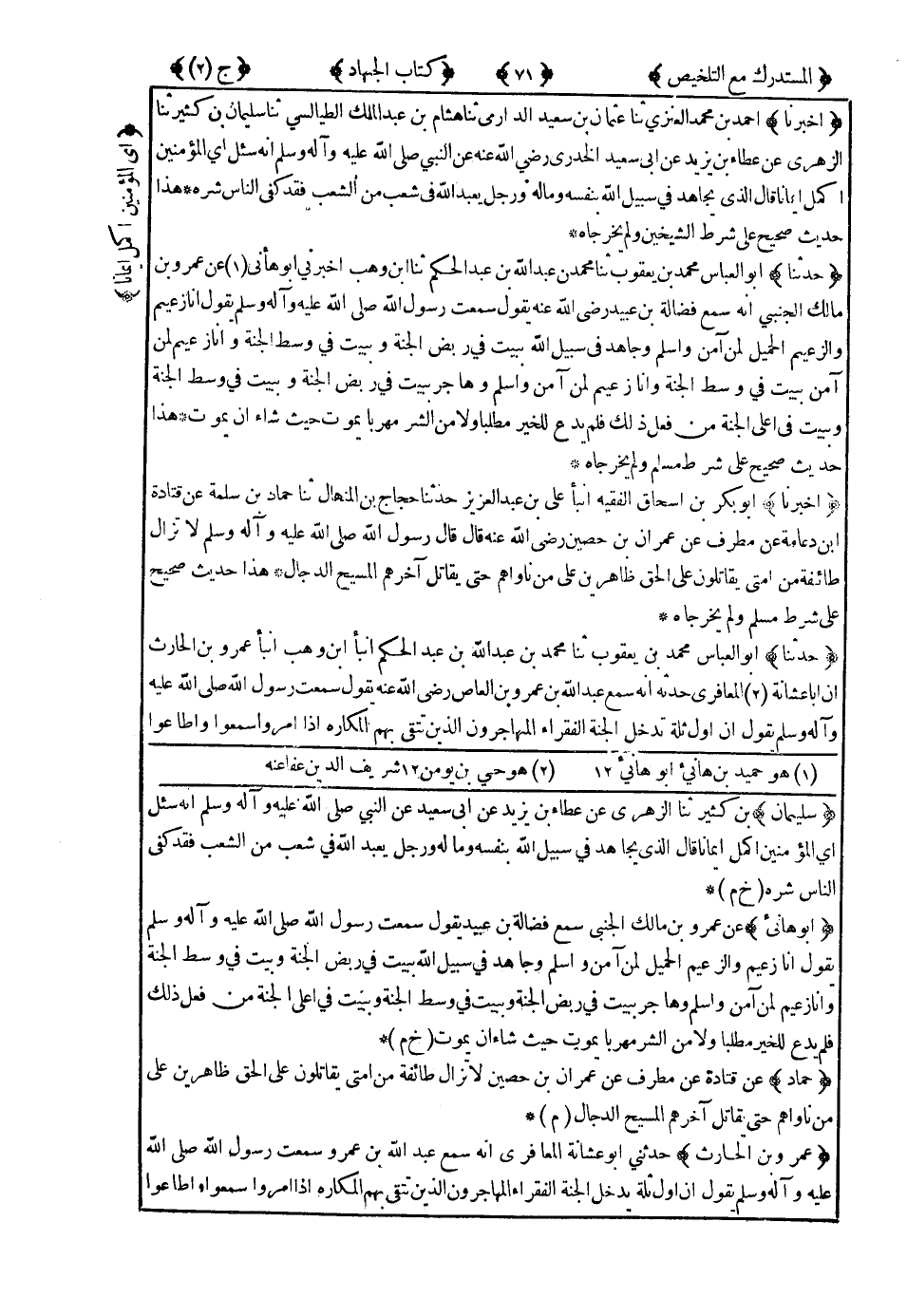 2392- أَخْبَرَنَا أَبُو بَكْرِ بْنُ إِسْحَاقَ الْفَقِيهُ ، أَنْبَأَ عَلِيُّ بْنُ عَبْدِ الْعَزِيزِ ، حَدَّثَنَا حَجَّاجُ بْنُ الْمِنْهَالِ ، حَدَّثَنَا حَمَّادُ بْنُ سَلَمَةَ ، عَنْ قَتَادَةَ بْنِ دِعَامَةَ ، عَنْ مُطَرِّفٍ ، عَنْ عِمْرَانَ بْنِ حُصَيْنٍ رَضِيَ اللَّهُ عَنْهُ ، قَالَ : قَالَ رَسُولُ اللهِ صَلَّى اللَّهُ عَلَيْهِ وَسَلَّمَ : لاَ تَزَالُ طَائِفَةٌ مِنْ أُمَّتِي يُقَاتِلُونَ عَلَى الْحَقِّ ظَاهِرِينَ عَلَى مَنْ نَاوَأَهُمْ حَتَّى يُقَاتِلَ آخِرُهُمُ الْمَسِيحَ الدَّجَّالَ.