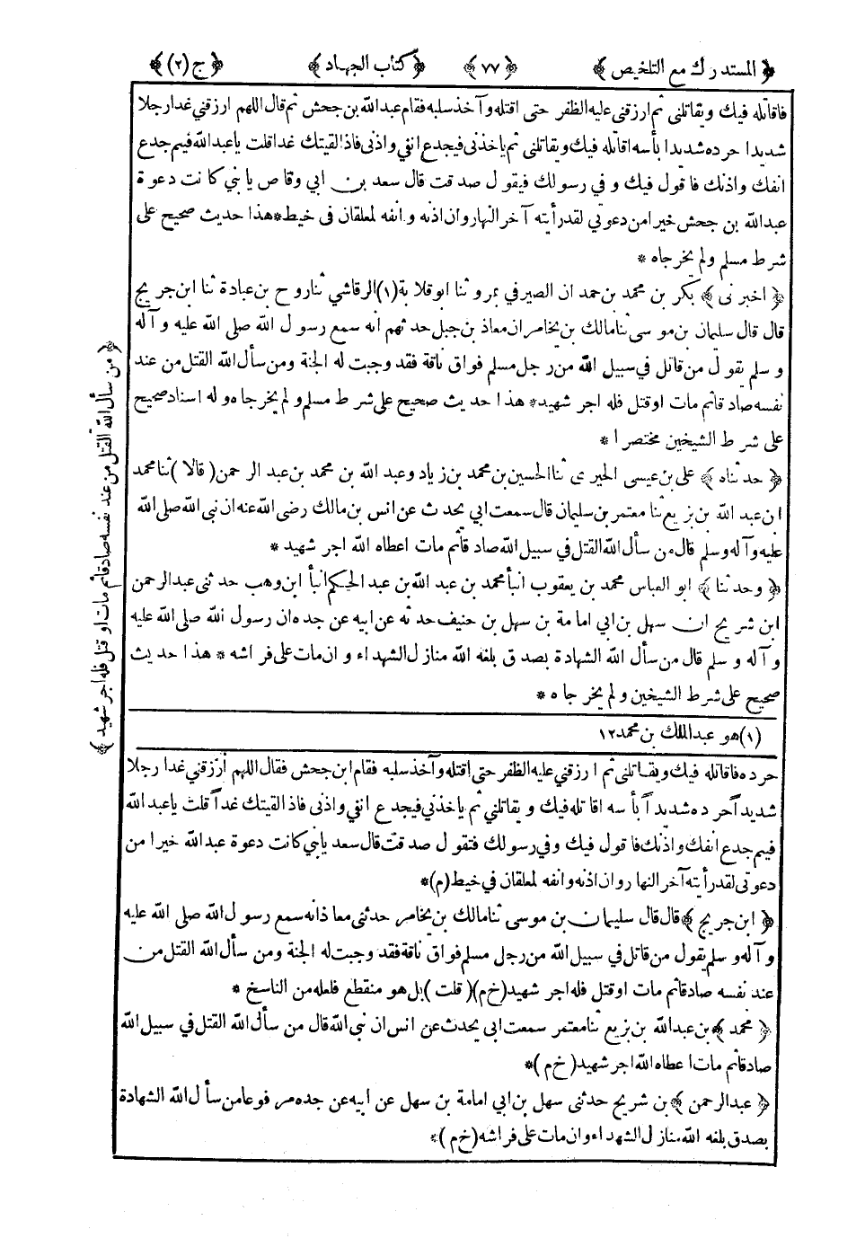 2411- حَدَّثَنَاهُ عَلِيُّ بْنُ عِيسَى الْحِيرِيُّ ، حَدَّثَنَا الْحُسَيْنُ بْنُ مُحَمَّدِ بْنِ زِيَادٍ ، وَعَبْدُ اللهِ بْنُ مُحَمَّدِ بْنِ عَبْدِ الرَّحْمَنِ ، قَالاَ : حَدَّثَنَا مُحَمَّدُ بْنُ عَبْدِ اللهِ بْنِ بَزِيعٍ ، حَدَّثَنَا مُعْتَمِرُ بْنُ سُلَيْمَانَ ، قَالَ : سَمِعْتُ أَبِيَ يُحَدِّثُ ، عَنْ أَنَسِ بْنِ مَالِكٍ رَضِيَ اللَّهُ عَنْهُ ، أَنَّ نَبِيَّ اللهِ صَلَّى اللَّهُ عَلَيْهِ وَسَلَّمَ ، قَالَ : مَنْ سَأَلَ اللَّهَ الْقَتْلَ فِي سَبِيلِ اللهِ صَادِقًا ، ثُمَّ مَاتَ ، أَعْطَاهُ اللَّهُ أَجْرَ شَهِيدٍ.