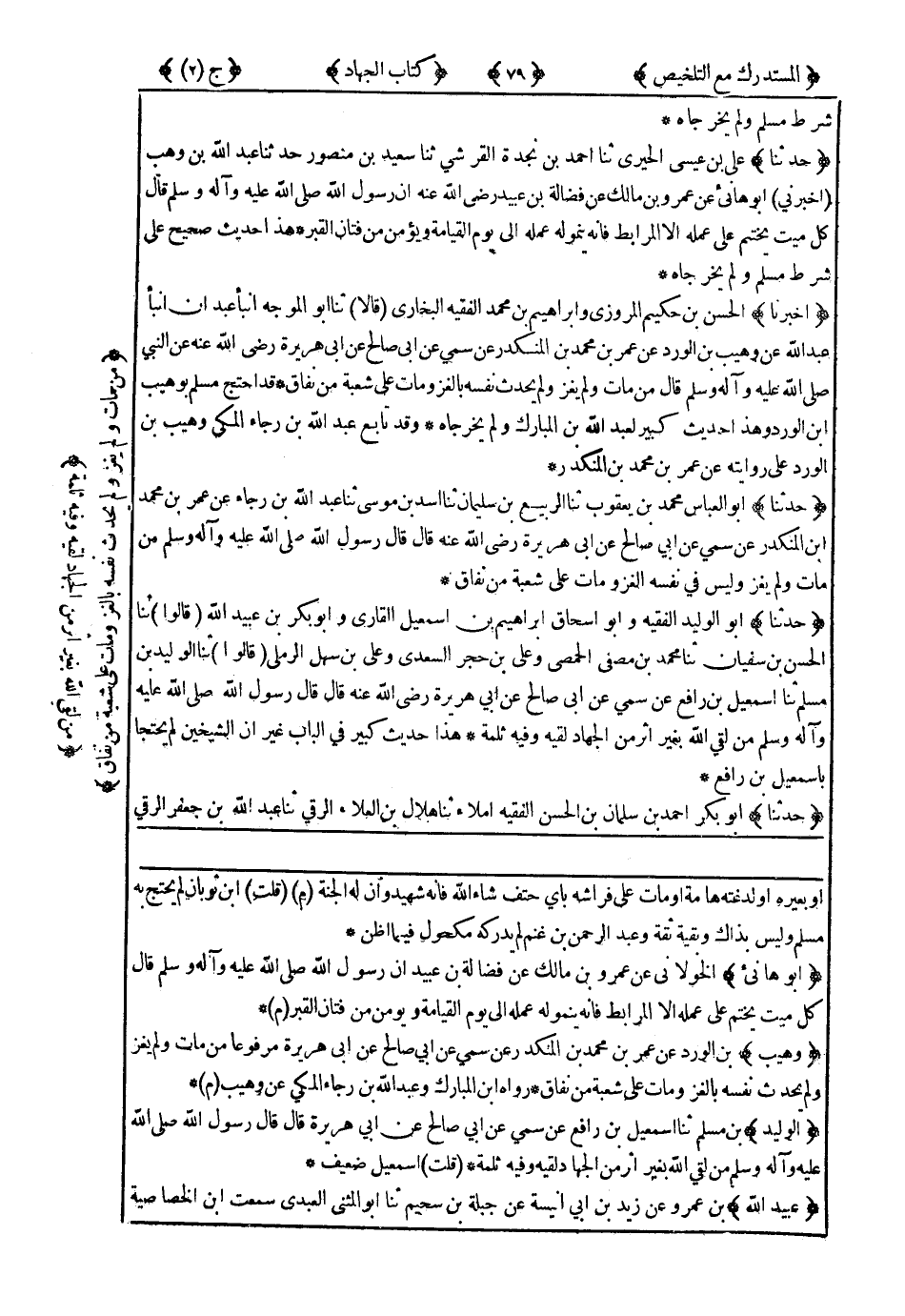 2418- أَخْبَرَنَا الْحَسَنُ بْنُ حَلِيمٍ الْمَرْوَزِيُّ ، وَإِبْرَاهِيمُ بْنُ مُحَمَّدٍ الْفَقِيهُ الْبُخَارِيُّ ، قَالاَ : حَدَّثَنَا أَبُو الْمُوَجِّهِ ، أَنْبَأَ عَبْدَانُ ، أَنْبَأَ عَبْدُ اللهِ ، عَنْ وُهَيْبِ بْنِ الْوَرْدِ ، عَنْ عُمَرَ بْنِ مُحَمَّدِ بْنِ الْمُنْكَدِرِ ، عَنْ سُمَيٍّ ، عَنْ أَبِي صَالِحٍ ، عَنْ أَبِي هُرَيْرَةَ رَضِيَ اللَّهُ عَنْهُ ، عَنِ النَّبِيِّ صَلَّى اللَّهُ عَلَيْهِ وَسَلَّمَ قَالَ : مَنْ مَاتَ وَلَمْ يَغْزُ وَلَمْ يُحَدِّثْ نَفْسَهُ بِالْغَزْوِ ، مَاتَ عَلَى شُعْبَةٍ مِنْ نِفَاقٍ .