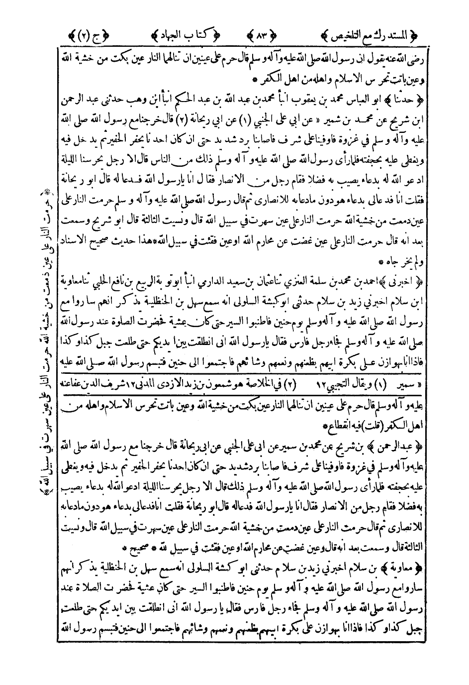 2432- حَدَّثَنَا أَبُو الْعَبَّاسِ مُحَمَّدُ بْنُ يَعْقُوبَ ، أَنْبَأَ مُحَمَّدُ بْنُ عَبْدِ اللهِ بْنِ عَبْدِ الْحَكَمِ ، أَنْبَأَ ابْنُ وَهْبٍ ، حَدَّثَنِي عَبْدُ الرَّحْمَنِ بْنُ شُرَيْحٍ ، عَنْ مُحَمَّدِ بْنِ شُمَيْرٍ ، عَنْ أَبِي عَلِيٍّ الْجَنْبِيِّ ، عَنْ أَبِي رَيْحَانَةَ ، قَالَ : خَرَجْنَا مَعَ رَسُولِ اللهِ صَلَّى اللَّهُ عَلَيْهِ وَسَلَّمَ فِي غَزْوَةٍ ، فَأَوْفَيْنَا عَلَى شَرَفٍ ، فَأَصَابَنَا بَرْدٌ شَدِيدٌ ، حَتَّى إِنْ كَانَ أَحَدُنَا يَحْفِرُ الْحَفِيرَ ، ثُمَّ يَدْخُلُ فِيهِ وَيُغَطِّي عَلَيْهِ بِحَجَفَتِهِ ، فَلَمَّا رَأَى رَسُولُ اللهِ صَلَّى اللَّهُ عَلَيْهِ وَسَلَّمَ ذَلِكَ مِنَ النَّاسِ قَالَ : أَلاَ رَجُلٌ يَحْرُسُنَا اللَّيْلَةَ أَدْعُو اللَّهَ لَهُ بِدُعَاءٍ يُصِيبُ بِهِ فَضْلاً فَقَامَ رَجُلٌ مِنَ الأَنْصَارِ فَقَالَ : أَنَا يَا رَسُولَ اللهِ . فَدَعَا لَهُ قَالَ أَبُو رَيْحَانَةَ : فَقُلْتُ : أَنَا ، فَدَعَا لِي بِدُعَاءٍ هُوَ دُونَ مَا دَعَا بِهِ لِلأَنْصَارِيِّ ، ثُمَّ قَالَ رَسُولُ اللهِ صَلَّى اللَّهُ عَلَيْهِ وَسَلَّمَ : حُرِّمَتِ النَّارُ عَلَى عَيْنٍ دَمَعَتْ مِنْ خَشْيَةِ اللهِ ، حُرِّمَتِ النَّارُ عَلَى عَيْنٍ سَهِرَتْ فِي سَبِيلِ اللهِ قَالَ : وَنَسِيتُ الثَّالِثَةَ . قَالَ أَبُو شُرَيْحٍ : وَسَمِعْتُ بَعْدُ أَنَّهُ قَالَ : حُرِّمَتِ النَّارُ عَلَى عَيْنٍ غَضَّتْ عَنْ مَحَارِمِ اللهِ ، أَوْ عَيْنٍ فُقِئَتْ فِي سَبِيلِ اللهِ .