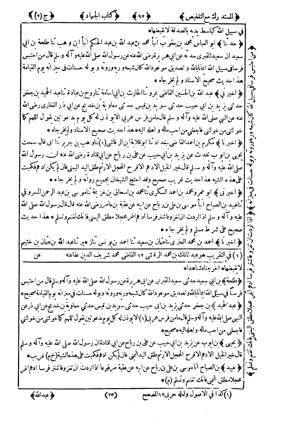 2456- حَدَّثَنَا أَبُو الْعَبَّاسِ مُحَمَّدُ بْنُ يَعْقُوبَ ، أَنْبَأَ مُحَمَّدُ بْنُ عَبْدِ اللهِ بْنِ عَبْدِ الْحَكَمِ ، أَنْبَأَ ابْنُ وَهْبٍ ، حَدَّثَنَا طَلْحَةُ بْنُ أَبِي سَعِيدٍ ، أَنَّ سَعِيدًا الْمَقْبُرِيَّ ، حَدَّثَهُ ، عَنْ أَبِي هُرَيْرَةَ رَضِيَ اللَّهُ عَنْهُ ، عَنْ رَسُولِ اللهِ صَلَّى اللَّهُ عَلَيْهِ وَسَلَّمَ قَالَ : مَنِ احْتَبَسَ فَرَسًا فِي سَبِيلِ اللهِ إِيمَانًا بِاللَّهِ وَتَصْدِيقَ مَوْعُودِ اللهِ ، كَانَ شِبَعُهُ وَرِيُّهُ وَرَوْثُهُ وَبَوْلُهُ حَسَنَاتٍ فِي مِيزَانِهِ يَوْمَ الْقِيَامَةِ .