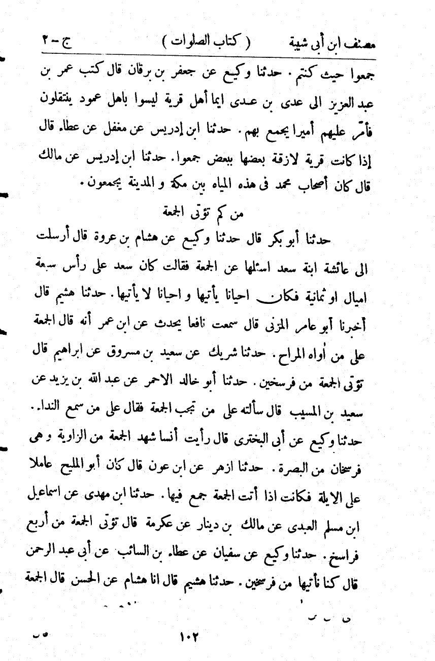 5111- حَدَّثَنَا ابْنُ إِدْرِيسَ ، عَنْ مَالِكٍ ، قَالَ : كَانَ أَصْحَابُ مُحَمَّدٍ صلى الله عليه وسلم فِي هَذِهِ الْمِيَاهِ بَيْنَ مَكَّةَ وَالْمَدِينَةِ يُجَمِّعُونَ.