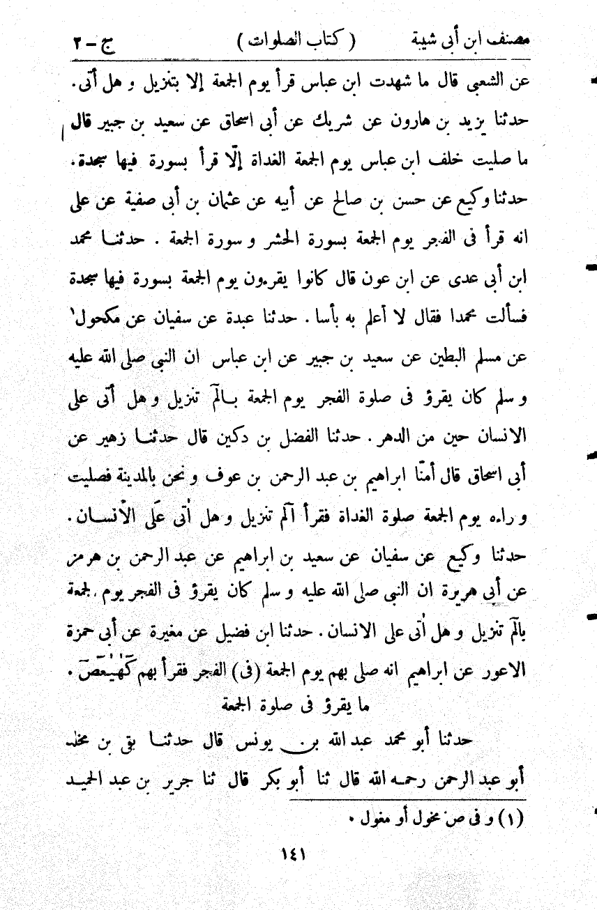 5490- حَدَّثَنَا عَبْدَةُ ، عَنْ سُفْيَانَ ، عَنْ مُخوَّلٍ ، عَنْ مُسْلِمٍ الْبَطِينِ ، عَنْ سَعِيدِ بْنِ جُبَيْرٍ ، عَنِ ابْنِ عَبَّاسٍ ؛ أَنَّ النَّبِيَّ صلى الله عليه وسلم كَانَ يَقْرَأُ فِي صَلاَةِ الْفَجْرِ يَوْمَ الْجُمُعَةِ بِـ : {الم تَنْزِيلُ} ، وَ{هَلْ أَتَى عَلَى الإِنْسَاْن حِينٌ مِنَ الدَّهْرِ}.