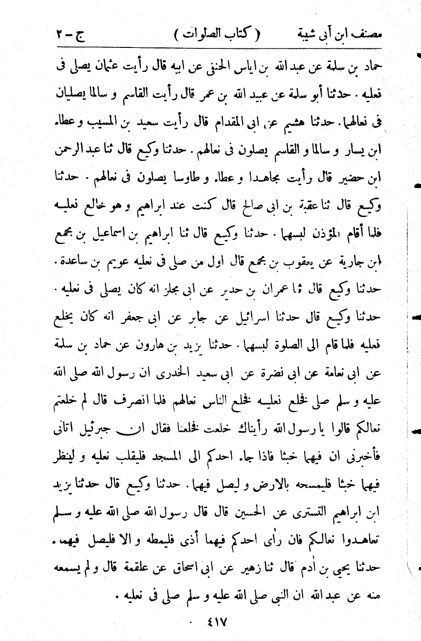 7967- حَدَّثَنَا أَبُو أُسَامَةَ ، عَنْ عُبَيْدِ اللهِ بْنِ عُمَرَ ، قَالَ : رَأَيْتُُ الْقَاسِمَ وَسَالِمًا يُصَلِّيَانِ فِي نِعَالِهِمَا.