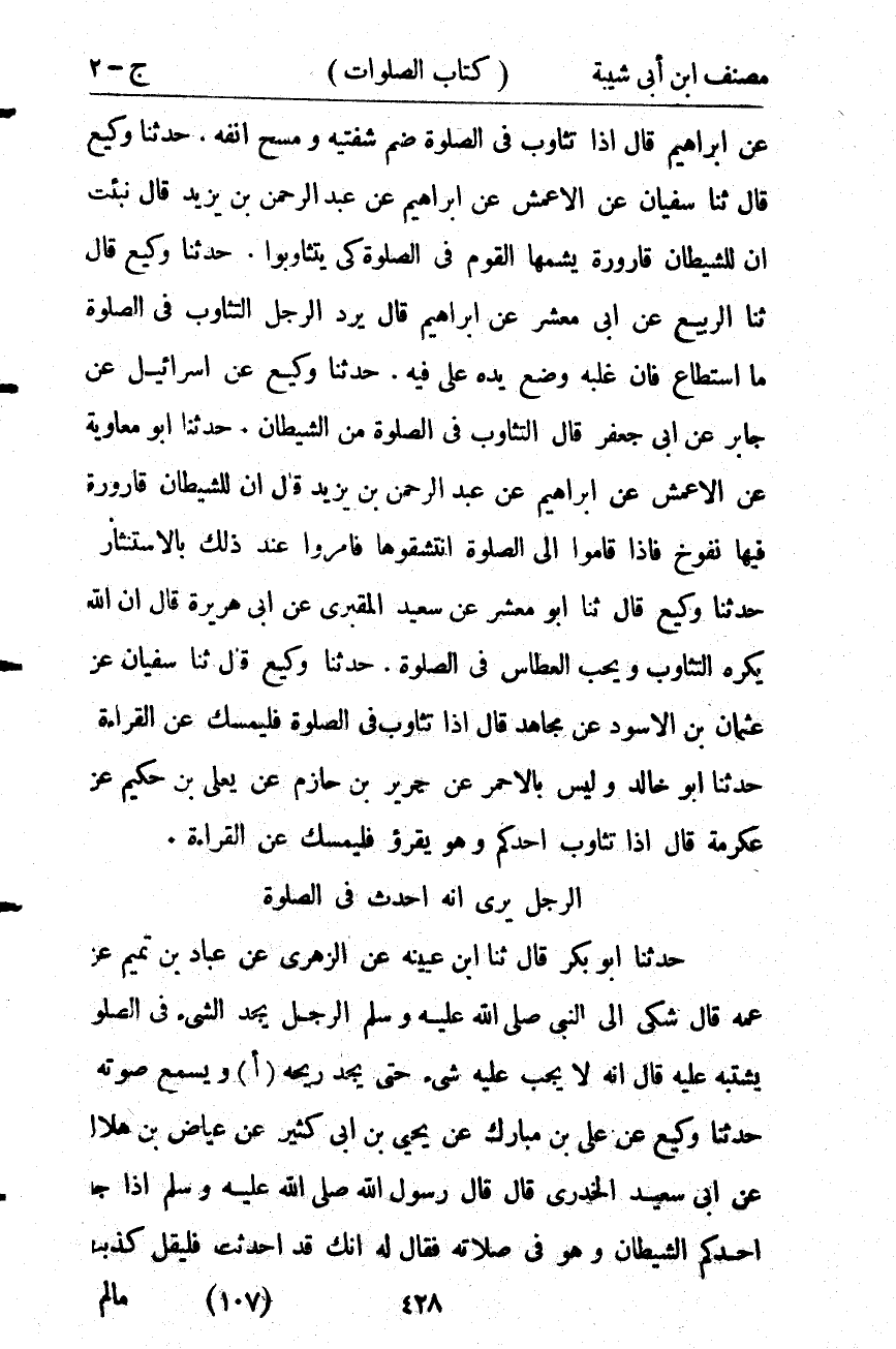 8072- حَدَّثَنَا وَكِيعٌ ، قَالَ : حدَّثَنَا سُفْيَانُ ، عَنِ الأَعْمَشِ ، عَنْ إِبْرَاهِيمَ ، عَن عَبْدِ الرَّحْمَنِ بْنِ يَزِيدَ ، قَالَ : نُبِّئْتُ أَنَّ لِلشَّيْطَانِ قَارُورَةً يُشِمُّهَا الْقَوْمَ فِي الصَّلاَة كَيْ يَتَثَاءَبُوا.