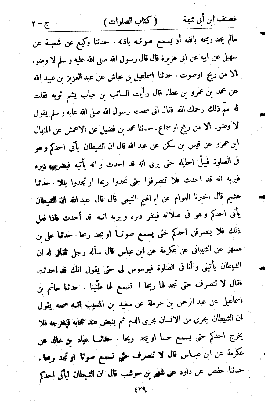 8083- حَدَّثَنَا مُحَمَّدُ بْنُ فُضَيْلٍ ، عَنِ الأَعْمَشِ ، عَنِ الْمِنْهَالِ بْنِ عَمْرٍو ، عَنْ قَيْسِ بْنِ سَكَنٍ ، عَنْ عَبْدِ اللهِ ، قَالَ : إنَّ الشَّيْطَانَ يَأْتِي أَحَدَكُمْ وَهُوَ فِي الصَّلاَة فَيَبَلُّ إحْلِيلَهُ حَتَّى يَرَى أَنَّهُ قَدْ أَحْدَثَ ، وَأَنَّهُ يَأْتِيهِ فَيَضْرِبُ دُبُرَهُ ، فَيُرِيهِ أَنَّهُ قَدْ أَحْدَثَ ، فَلاَ تَنْصَرِفُوا حَتَّى تَجِدُوا رِيحًا ، أَوْ تَجِدُوا بَلَلاً.