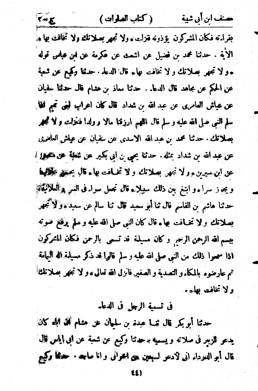 8184- حَدَّثَنَا هَاشِمُ بْنُ الْقَاسِمِ ، قَالَ : حدَّثَنَا أَبُو سَعِيدٍ ، قَالَ : حَدَّثَنَا سَالِمٌ ، عَنْ سَعِيدٍ : {وَلاَ تَجْهَرْ بِصَلاَتِكَ وَلاَ تُخَافِتْ بِهَا} ، قَالَ : كَانَ النَّبِيُّ صلى الله عليه وسلم يَرْفَعُ صَوْتَهُ بِبِسْمِ اللهِ الرَّحْمَن الرَّحِيمِ وَكَانَ مُسَيْلِمَةُ قَدْ تَسَمَّى الرَّحْمَان ، فَكَانَ الْمُشْرِكُونَ إذَا سَمِعُوا ذَلِكَ مِنَ النَّبِيِّ صلى الله عليه وسلم قَالُوا : قَدْ ذَكَرَ مُسَيْلِمَةَ إلَهَ الْيَمَامَةِ ، ثُمَّ عَارَضُوهُ بِالْمُكَاءِ وَالتَّصْدِيَةِ وَالصَّفِيرِ فَأَنْزَلَ اللَّهُ تَعَالَى : {وَلاَ تَجْهَرْ بِصَلاَتِكَ وَلاَ تُخَافِتْ بِهَا}.