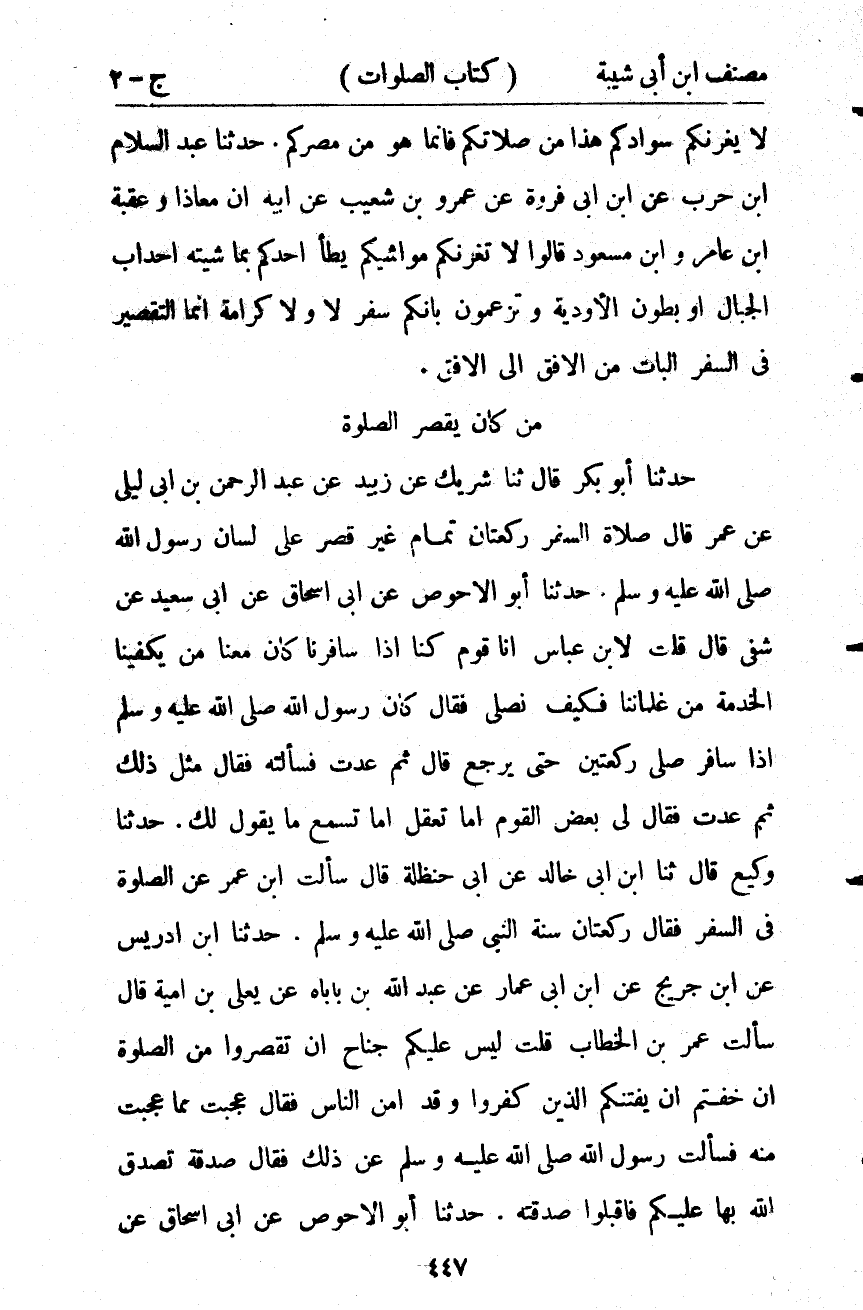 8241- حَدَّثَنَا أَبُو الأَحْوَصِ ، عَنْ أَبِي إِسْحَاقَ ، عَنْ سَعِيدِ بْنِ شُفَيٍّ ، قَالَ : قُلْتُ لاِبْنِ عَبَّاسٍ : إنَّا قَوْمٌ كُنَّا إذَا سَافَرْنَا كَانَ مَعَنَا مَنْ يَكْفِينَا الْخِدْمَةَ مِنْ غِلْمَانِنَا فَكَيْفَ نُصَلِّي ؟ فَقَالَ : كَانَ رَسُولُ اللهِ صلى الله عليه وسلم إذَا سَافَرَ صَلَّى رَكْعَتَيْنِ حَتَّى يَرْجِعَ ، قَالَ : ثُمَّ عُدْتُ فَسَأَلْتُهُ فَقَالَ مِثْلَ ذَلِكَ ، ثُمَّ عُدْت فَقَالَ لِي بَعْضُ الْقَوْمِ : أَمَا تَعْقِلُ أَمَا تَسْمَعُ مَا يَقُولُ لَك.