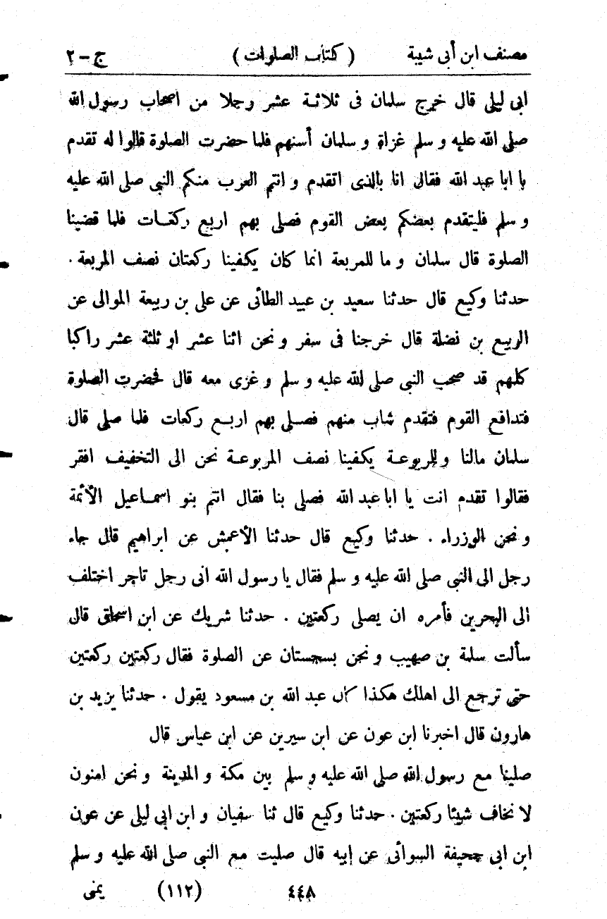 8247- حَدَّثَنَا شَرِيكٌ ، عَنِ أَبِي إِسْحَاقَ ، قَالَ : سَأَلْتُ سَلَمَةَ بْنَ صُهَيْبٍ وَنَحْنُ بِسِجِسْتَانَ ، عَنِ الصَّلاَة ، فَقَالَ : رَكْعَتَيْنِ رَكْعَتَيْنِ حَتَّى تَرْجِعَ إلَى أَهْلِكَ ، هَكَذَا كَانَ عَبْدُ اللهِ بْنُ مَسْعُودٍ يَقُولُ.