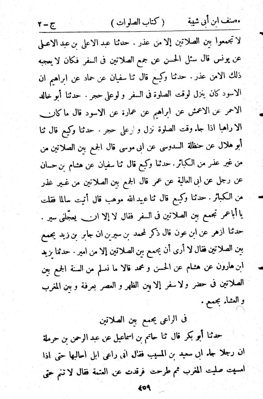 8339- حَدَّثَنَا وَكِيعٌ ، قَالَ : حدَّثَنَا عُبَيدِ اللهِ بْنُ عَبْدِ الرَّحْمَنِ بْنِ مَوْهَبٍ ، قَالَ : أَتَيْتُُ سَالِمًا فَقُلْتُ يَا أَبَا عُمَرَ تَجْمَعُ بَيْنَ الصَّلاَتَيْنِ فِي السَّفَرِ ؟ فَقَالَ : لاَ إِلاَّ أَنْ يَعْجَلَنِي سَيْرٌ.