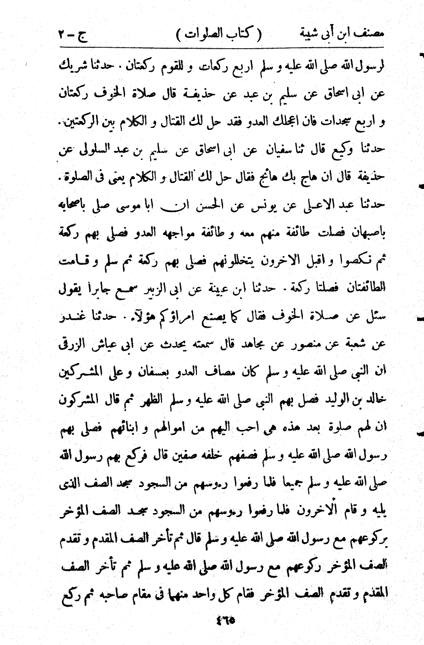8374- حَدَّثَنَا شَرِيكٌ ، عَنْ أَبِي إِسْحَاقَ ، عَنْ سُلَيْمِ بْنِ عَبْدٍ ، عَنْ حُذَيْفَةَ ، قَالَ : صَلاَةُ الْخَوْفِ رَكْعَتَانِ وَأَرْبَعُ سَجَدَاتٍ ، فَإِنْ أَعْجَلَكَ الْعَدُوُّ فَقَدْ حَلَّ لَكَ الْقِتَالُ وَالْكَلاَمُ بَيْنَ الرَّكْعَتَيْنِ.