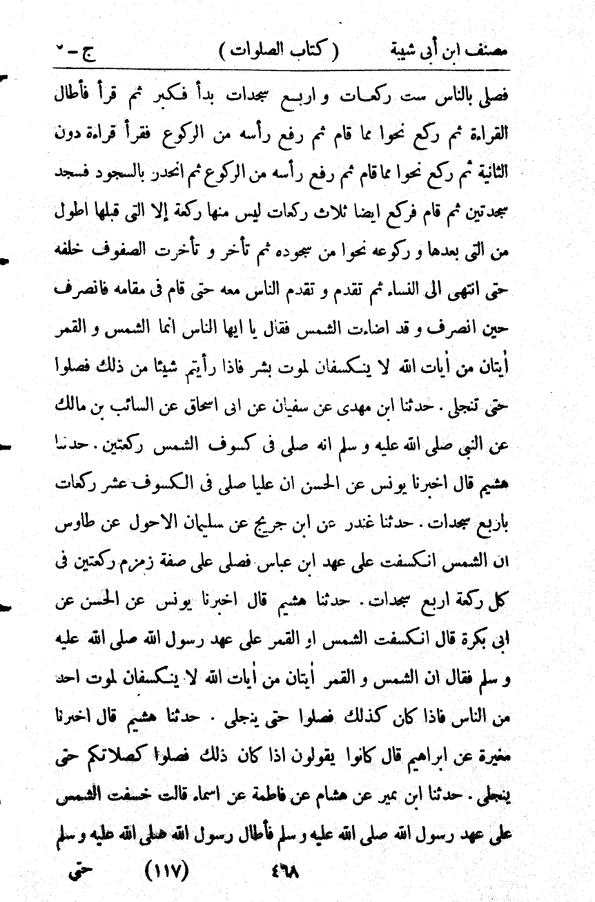 8392- حَدَّثَنَا هُشَيْمٌ قَالَ : أَخْبَرَنَا يُونُسُ ، عَنِ الْحَسَنِ : أَنَّ عَلِيًّا صَلَّى فِي الْكُسُوفِ عَشْرَ رَكَعَاتٍ بِأَرْبَعِ سَجَدَاتٍ.