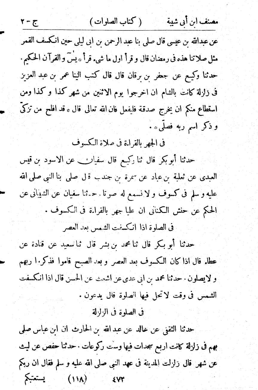 8416- حَدَّثَنَا سُفْيَانُ ، عَنِ الشَّيْبَانِيِّ ، عَنِ الْحَكَمِ ، عَنْ حَنَشٍ الْكِنَانِيِّ : أَنَّ عَلِيًّا جَهَرَ بِالْقِرَاءَةِ فِي الْكُسُوفِ.