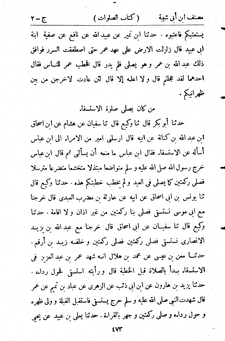8424- حَدَّثَنَا وَكِيعٌ ، قَالَ : حدَّثَنَا سُفْيَانُ ، عَنْ أَبِي إِسْحَاقَ ، قَالَ : خَرَجْنَا مَعَ عَبْدِ اللهِ بْنِ يَزِيدَ الأَنْصَارِيِّ نَسْتَسْقِي ، فَصَلَّى رَكْعَتَيْنِ وَخَلْفَهُ زَيْدُ بْنُ أَرْقَمَ.