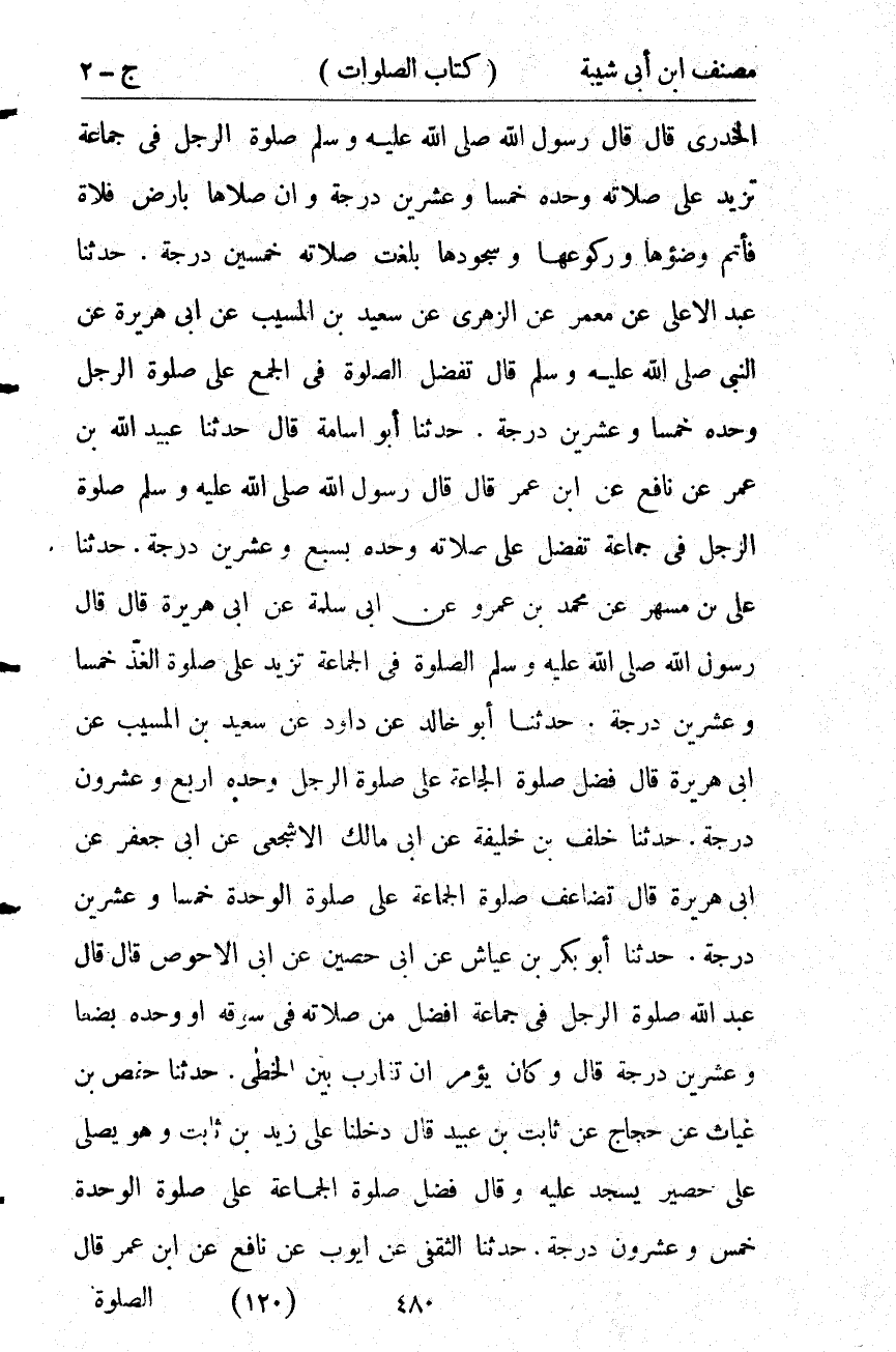 8484- حَدَّثَنَا الثَّقَفِيُّ ، عَنْ أَيُّوبَ ، عَنْ نَافِعٍ ، عَنِ ابْنِ عُمَرَ ، قَالَ : الصَّلاَة مَعَ الإِمَامِ تَفْضُلُ عَلَى صَلاَتِهِ وَحْدَهُ سَبْعًا وَعِشْرِينَ دَرَجَةً.