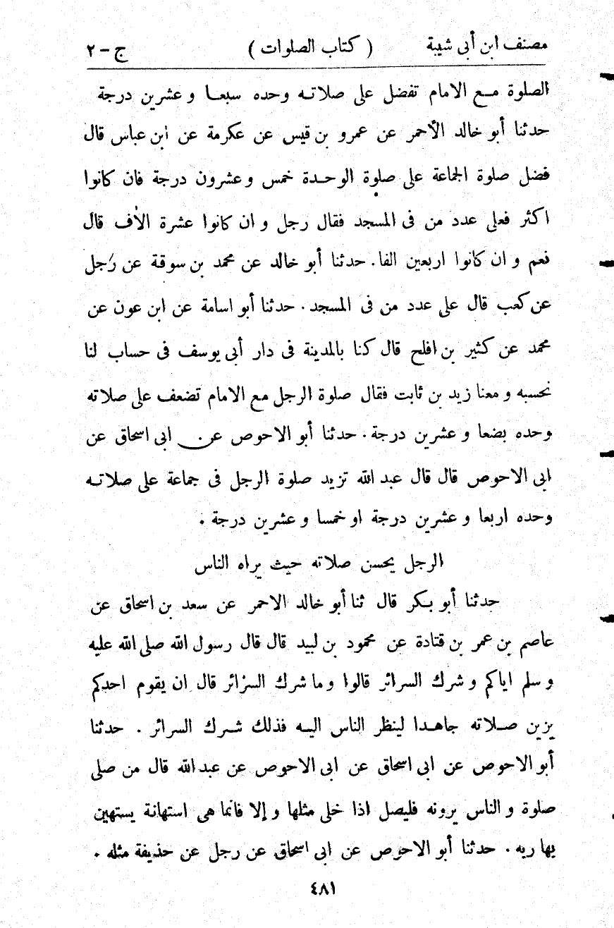 8488- حَدَّثَنَا أَبُو الأَحْوَصِ ، عَنْ أَبِي إِسْحَاقَ ، عَنْ أَبِي الأَحْوَص ، قَالَ : قَالَ عَبْدُ اللهِ : تَزِيدُ صَلاَةُ الرَّجُلِ فِي جَمَاعَةٍ عَلَى صَلاَتِهِ وَحْدَهُ أَرْبَعًا وَعِشْرِينَ دَرَجَةً ، أَوْ خَمْسًا وَعِشْرِينَ دَرَجَةً.