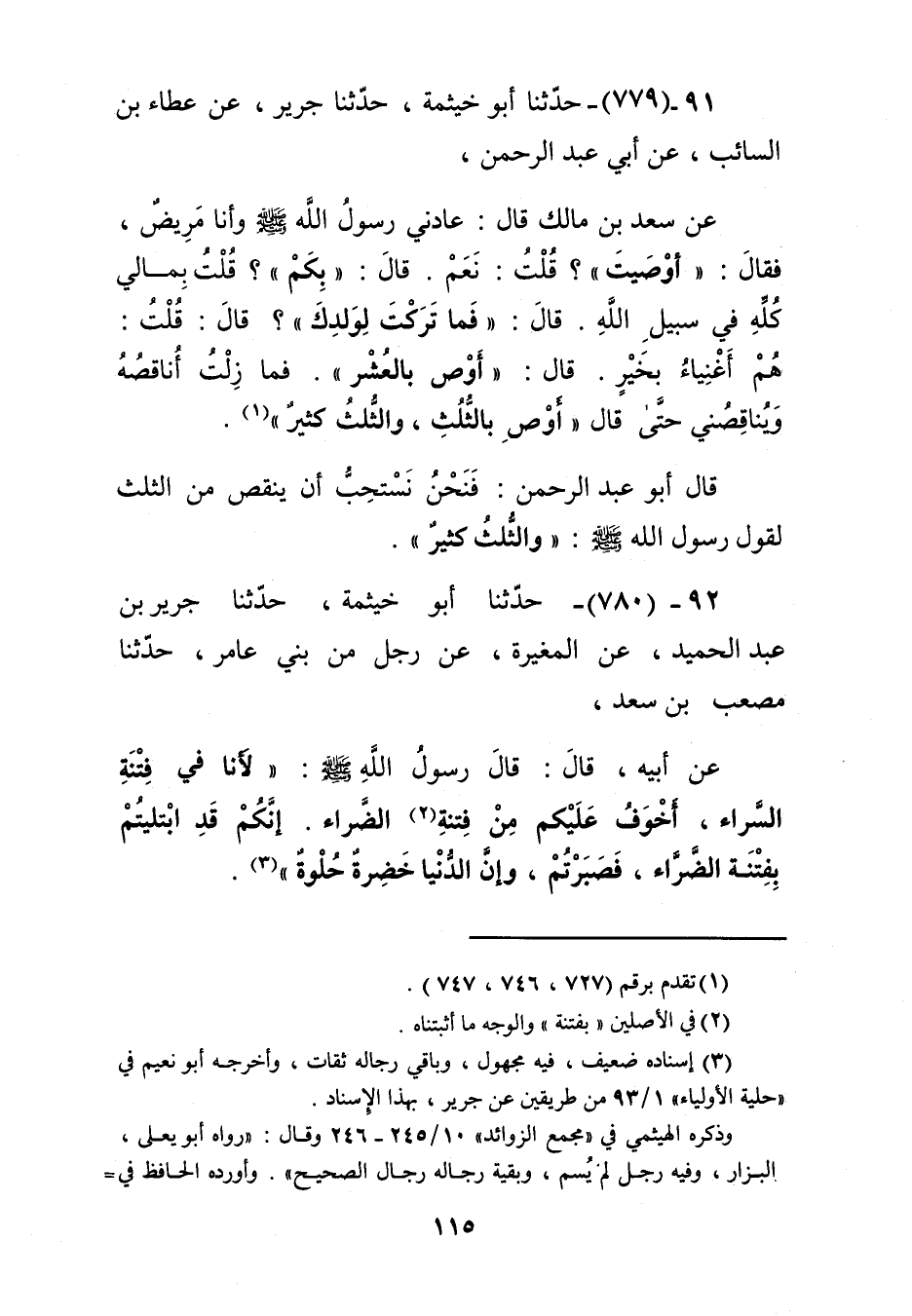 779 - حَدَّثَنَا أَبُو خَيْثَمَةَ، حَدَّثَنَا جَرِيرٌ، عَنْ عَطَاءِ بْنِ السَّائِبِ، عَنْ أَبِي عَبْدِ الرَّحْمَنِ، عَنْ سَعْدِ بْنِ مَالِكٍ، قَالَ: عَادَنِي رَسُولُ اللَّهِ صَلَّى اللهُ عَلَيْهِ وَسَلَّمَ وَأَنَا مَرِيضٌ فَقَالَ: «أَوْصَيْتَ؟» قُلْتُ: نَعَمْ، قَالَ: «بِكُمْ؟» قُلْتُ: بِمَالِي كُلِّهِ فِي سَبِيلِ اللَّهِ، قَالَ: «فَمَا تَرَكْتَ لِوَلَدِكَ؟» قَالَ: قُلْتُ: هُمْ أَغْنِيَاءُ بِخَيْرٍ، قَالَ: «أَوْصِ بِالْعُشْرِ» فَمَا زِلْتُ أُنَاقِصُهُ وَيُنَاقِصُنِي حَتَّى قَالَ: «§أَوْصِ بِالثُّلُثِ وَالثُّلُثُ كَثِيرٌ» قَالَ أَبُو عَبْدِ الرَّحْمَنِ: فَنَحْنُ نَسْتَحِبُّ أَنْ يُنْقَصَ مِنَ الثُّلُثِ لِقَوْلِ رَسُولِ اللَّهِ صَلَّى اللهُ عَلَيْهِ وَسَلَّمَ «وَالثُّلُثُ كَثِيرٌ»