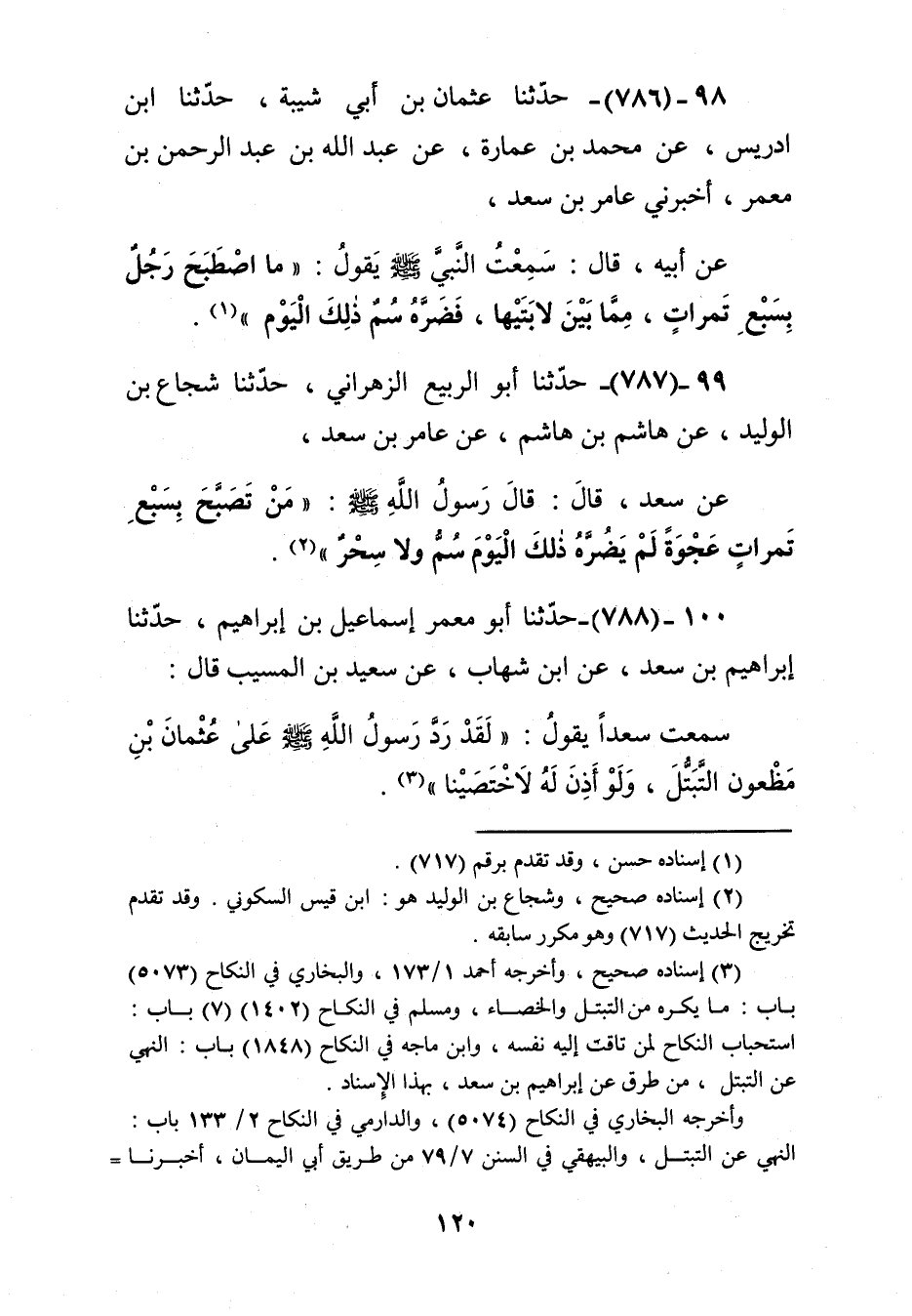 786 - حَدَّثَنَا عُثْمَانُ بْنُ أَبِي شَيْبَةَ، حَدَّثَنَا ابْنُ إِدْرِيسَ، عَنْ مُحَمَّدِ بْنِ عُمَارَةَ، عَنْ عَبْدِ اللَّهِ بْنِ عَبْدِ الرَّحْمَنِ بْنِ مَعْمَرٍ، أَخْبَرَنِي عَامِرُ بْنُ سَعْدٍ، عَنْ أَبِيهِ، قَالَ: سَمِعْتُ النَّبِيَّ صَلَّى اللهُ عَلَيْهِ وَسَلَّمَ يَقُولُ: «§مَا اصْطَبَحَ رَجُلٌ بِسَبْعِ تَمَرَاتٍ مِمَّا بَيْنَ لَابَتَيْهَا فَضَرَّهُ سُمٌّ ذَلِكَ الْيَوْمَ» Kإسناده حسن