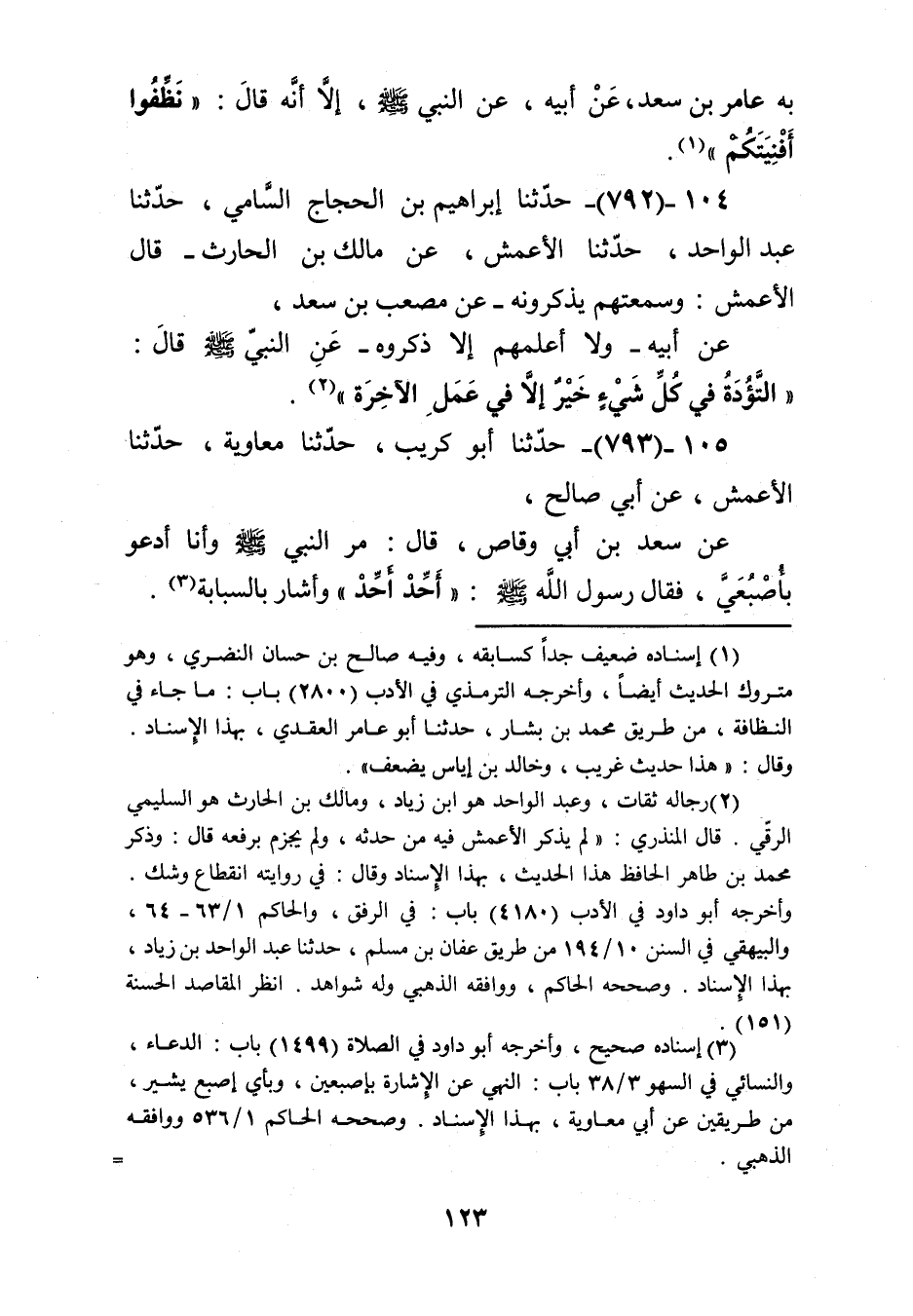 792 - حَدَّثَنَا إِبْرَاهِيمُ بْنُ الْحَجَّاجِ السَّامِيُّ، حَدَّثَنَا عَبْدُ الْوَاحِدِ، حَدَّثَنَا الْأَعْمَشُ، عَنْ مَالِكِ بْنِ الْحَارِثِ، - قَالَ الْأَعْمَشُ: وَسَمِعْتُهُمْ يَذْكُرُونَهُ، عَنْ مُصْعَبِ بْنِ سَعْدٍ، عَنْ أَبِيهِ، - وَلَا أَعْلَمُهُمْ إِلَّا ذَكَرُوهُ، عَنِ النَّبِيِّ صَلَّى اللهُ عَلَيْهِ وَسَلَّمَ قَالَ: «§التُّؤَدَةُ فِي كُلِّ شَيْءٍ خَيْرٌ إِلَّا فِي عَمَلِ الْآخِرَةِ» Kرجاله ثقات