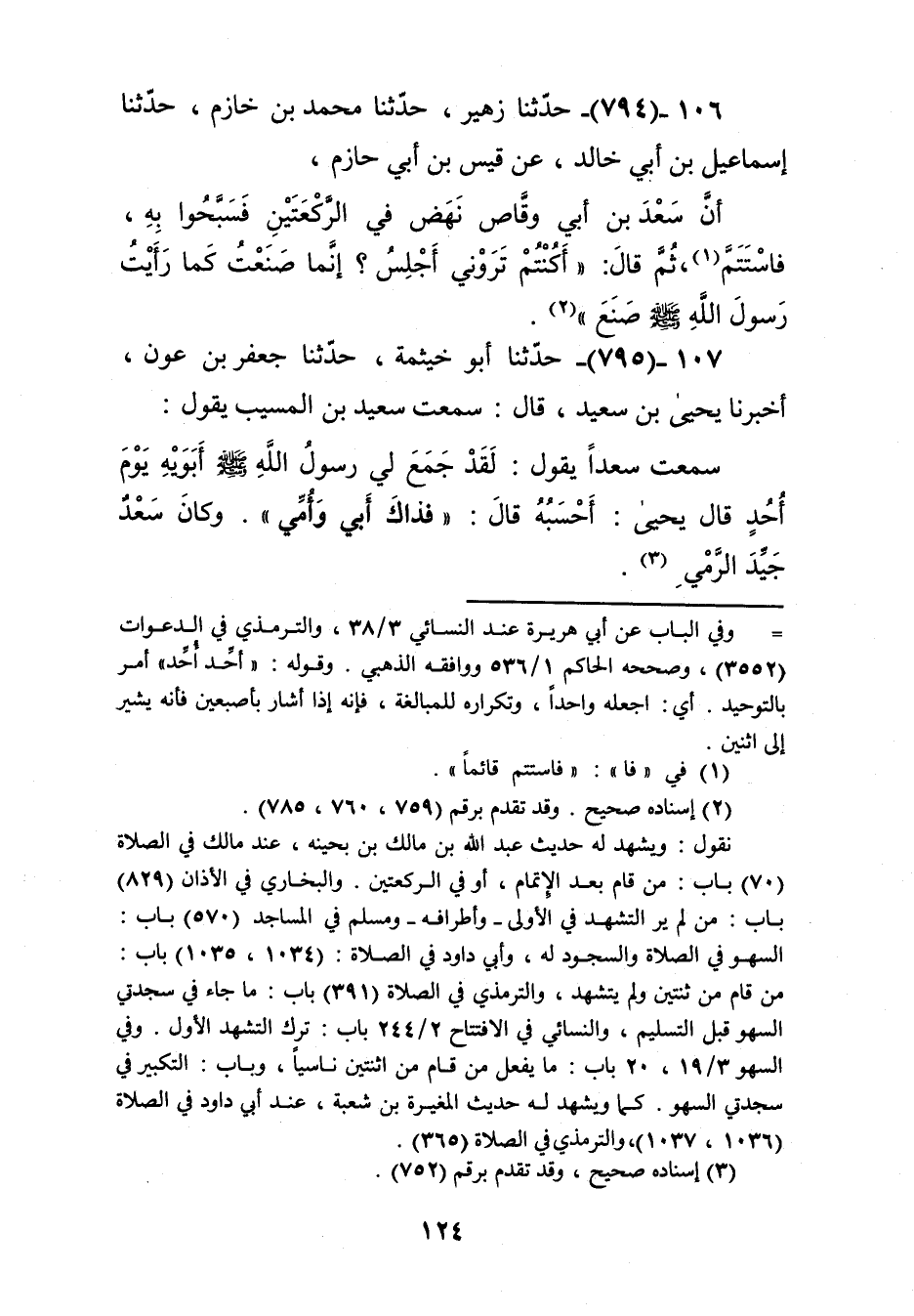 794 - حَدَّثَنَا زُهَيْرٌ، حَدَّثَنَا مُحَمَّدُ بْنُ خَازِمٍ، حَدَّثَنَا إِسْمَاعِيلُ بْنُ أَبِي خَالِدٍ، عَنْ قَيْسِ بْنِ أَبِي حَازِمٍ، أَنَّ سَعْدَ بْنَ أَبِي وَقَّاصٍ، §نَهَضَ فِي الرَّكْعَتَيْنِ، فَسَبَّحُوا بِهِ فَاسْتَتَمَّ، ثُمَّ قَالَ: «أَكُنْتُمْ تَرَوْنِي أَجْلِسُ؟ إِنَّمَا صَنَعْتُ كَمَا رَأَيْتُ رَسُولَ اللَّهِ صَلَّى اللهُ عَلَيْهِ وَسَلَّمَ صَنَعَ» Kإسناده صحيح