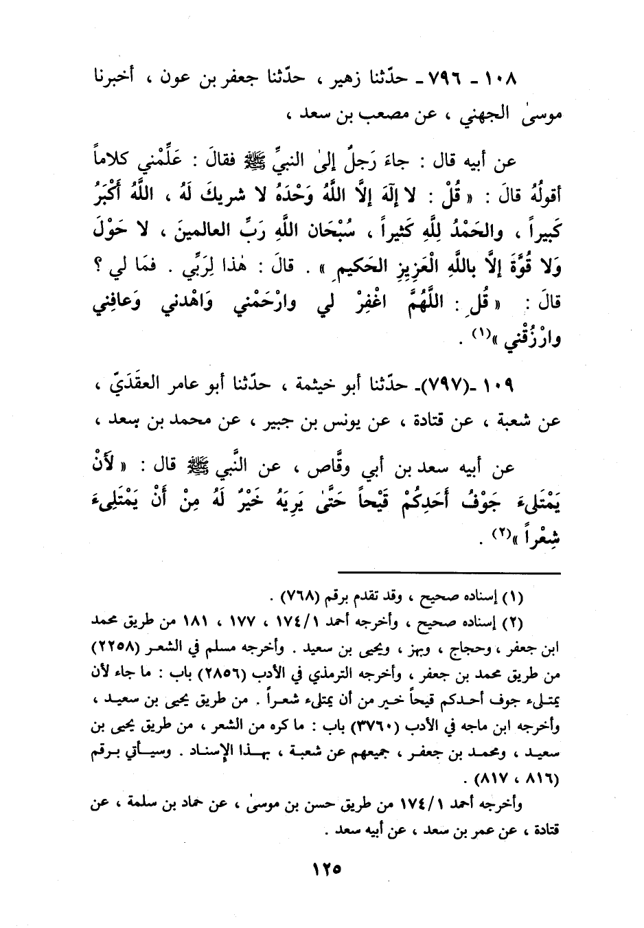 796 - حَدَّثَنَا زُهَيْرٌ، حَدَّثَنَا جَعْفَرُ بْنُ عَوْنٍ، أَخْبَرَنَا مُوسَى الْجُهَنِيُّ، عَنْ مُصْعَبِ بْنِ سَعْدٍ، عَنْ أَبِيهِ، قَالَ: جَاءَ رَجُلٌ إِلَى النَّبِيِّ صَلَّى اللهُ عَلَيْهِ وَسَلَّمَ فَقَالَ: عَلِّمْنِي كَلَامًا أَقَوْلُهُ، قَالَ: " §قُلْ: لَا إِلَهَ إِلَّا اللَّهُ وَحْدَهُ لَا شَرِيكَ لَهُ، وَاللَّهُ أَكْبَرُ كَبِيرًا، وَالْحَمْدُ لِلَّهِ كَثِيرًا، سُبْحَانَ اللَّهِ رَبِّ الْعَالَمِينَ، لَا حَوْلَ وَلَا قُوَّةَ إِلَّا بِاللَّهِ الْعَزِيزِ الْحَكِيمِ " قَالَ: هَذَا لِرَبِّي، فَمَا لِي؟ قَالَ: " قُلِ: اللَّهُمَّ اغْفِرْ لِي وَارْحَمْنِي، وَاهْدِنِي، وَعَافِنِي، وَارْزُقْنِي "Kإسناده صحيح