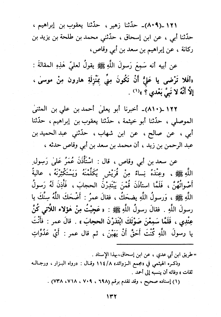 809 - حَدَّثَنَا زُهَيْرٌ، حَدَّثَنَا يَعْقُوبُ بْنُ إِبْرَاهِيمَ، حَدَّثَنَا أَبِي، عَنِ ابْنِ إِسْحَاقَ، حَدَّثَنِي مُحَمَّدُ بْنُ طَلْحَةَ بْنِ يَزِيدَ بْنِ رُكَانَةَ، عَنْ إِبْرَاهِيمَ بْنِ سَعْدِ بْنِ أَبِي وَقَّاصٍ، عَنْ أَبِيهِ، أَنَّهُ سَمِعَ رَسُولَ اللَّهِ صَلَّى اللهُ عَلَيْهِ وَسَلَّمَ يَقُولُ لِعَلِيٍّ هَذِهِ الْمَقَالَةَ: «§أَفَلَا تَرْضَى يَا عَلِيُّ أَنْ تَكُونَ مِنِّي بِمَنْزِلَةِ هَارُونَ مِنْ مُوسَى، إِلَّا أَنَّهُ لَا نَبِيَّ بَعْدِي» Kإسناده صحيح