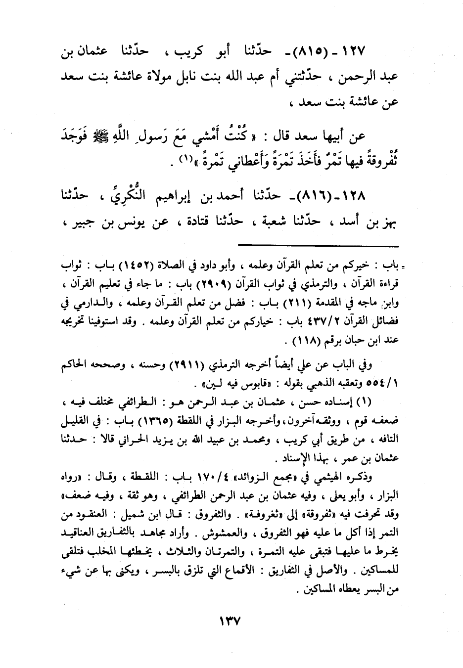 815 - حَدَّثَنَا أَبُو كُرَيْبٍ، حَدَّثَنَا عُثْمَانُ بْنُ عَبْدِ الرَّحْمَنِ، حَدَّثَتْنِي أُمُّ عَبْدِ اللَّهِ بِنْتُ نَابِلٍ، مَوْلَاةُ عَائِشَةَ بِنْتِ سَعْدٍ، عَنْ عَائِشَةَ بِنْتِ سَعْدٍ، عَنْ أَبِيهَا سَعْدٍ، قَالَ: «§كُنْتُ أَمْشِي مَعَ رَسُولِ اللَّهِ صَلَّى اللهُ عَلَيْهِ وَسَلَّمَ، فَوَجَدَ ثُفْرُوقَةً فِيهَا تَمْرٌ، فَأَخَذَ تَمْرَةً وَأَعْطَانِي تَمْرَةً» Kإسناده حسن