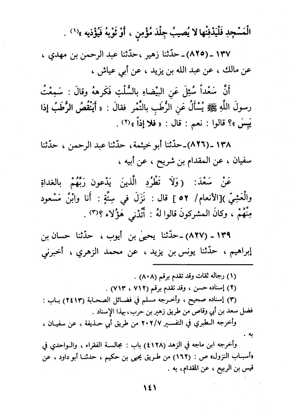 826 - حَدَّثَنَا أَبُو خَيْثَمَةَ، حَدَّثَنَا عَبْدُ الرَّحْمَنِ، حَدَّثَنَا سُفْيَانُ، عَنِ الْمِقْدَامِ بْنِ شُرَيْحٍ، عَنْ أَبِيهِ، عَنْ سَعْدٍ: {§وَلَا تُطْرُدِ الَّذِينَ يَدْعُونَ رَبَّهُمْ بِالْغَدَاةِ} [الأنعام: 52] وَالْعَشِيِّ قَالَ: " نَزَلَ فِي سِتَّةٍ، أَنَا وَابْنُ مَسْعُودٍ مِنْهُمْ، وَكَانَ الْمُشْرِكُونَ قَالُوا لَهُ: أَتُدْنِي هَؤُلَاءِ؟ "Kإسناده صحيح