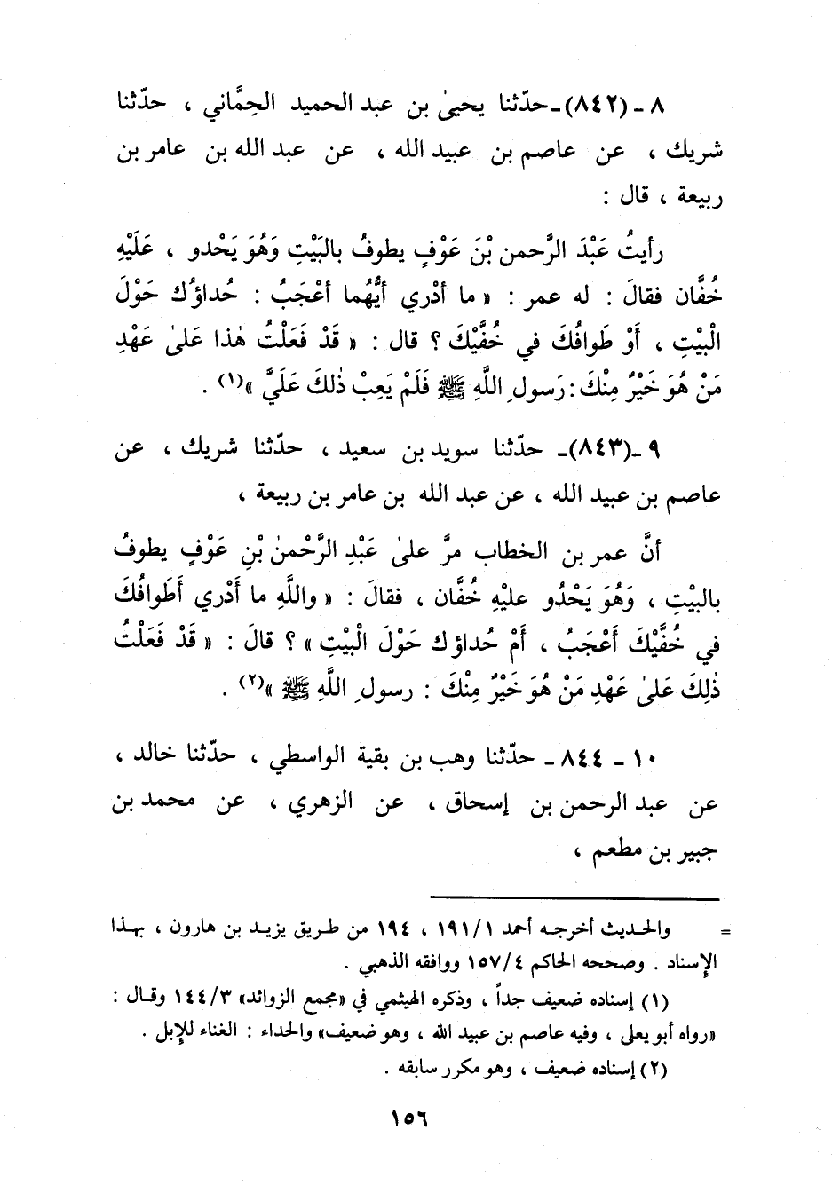 842 - حَدَّثَنَا يَحْيَى بْنُ عَبْدِ الْحَمِيدِ الْحِمَّانِيُّ، حَدَّثَنَا شَرِيكٌ، عَنْ عَاصِمِ بْنِ عُبَيْدِ اللَّهِ، عَنْ عَبْدِ اللَّهِ بْنِ عَامِرِ بْنِ رَبِيعَةَ قَالَ: رَأَيْتُ عَبْدَ الرَّحْمَنِ بْنَ عَوْفٍ يَطُوفُ بِالْبَيْتِ وَهُوَ يَحْدُو عَلَيْهِ خُفَّانِ، فَقَالَ لَهُ عُمَرُ: مَا أَدْرِي أَيُّهُمَا أَعْجَبُ: حُدَاؤُكَ حَوْلَ الْبَيْتِ أَوْ طَوَافُكَ فِي خُفَّيْكَ؟ قَالَ: " §قَدْ فَعَلْتُ هَذَا عَلَى عَهْدِ مَنْ هُوَ خَيْرٌ مِنْكَ: رَسُولِ اللَّهِ صَلَّى اللهُ عَلَيْهِ وَسَلَّمَ فَلَمْ يَعِبْ ذَلِكَ عَلَيَّ "Kإسناده ضعيف جدا