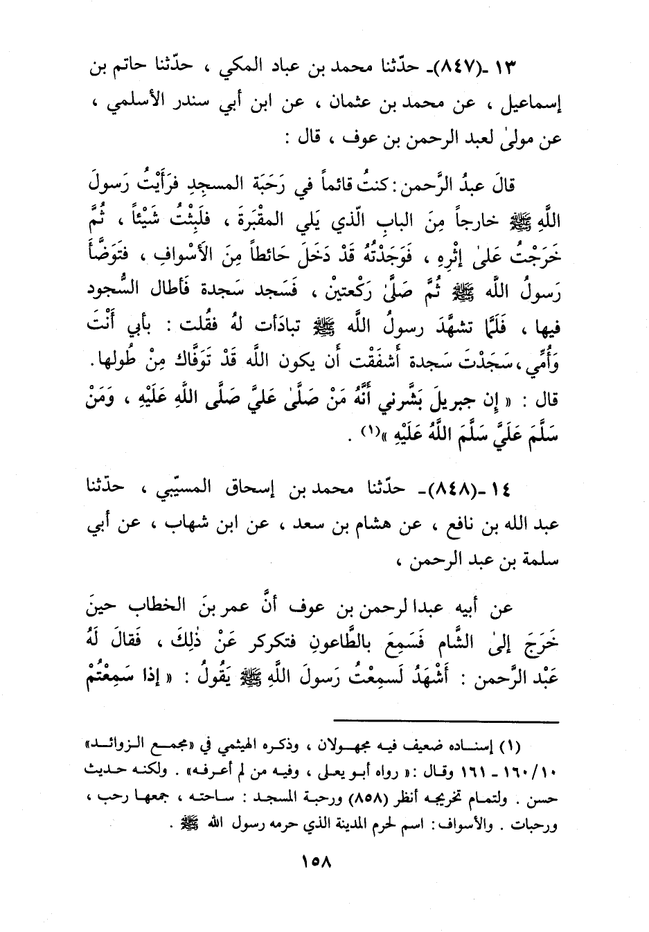 847 - حَدَّثَنَا مُحَمَّدُ بْنُ عَبَّادٍ الْمَكِّيُّ، حَدَّثَنَا حَاتِمُ بْنُ إِسْمَاعِيلَ، عَنْ مُحَمَّدِ بْنِ عُثْمَانَ، عَنِ ابْنِ أَبِي سَنْدَرٍ الْأَسْلَمِيِّ، عَنْ مَوْلًى لِعَبْدِ الرَّحْمَنِ بْنِ عَوْفٍ قَالَ: قَالَ عَبْدُ الرَّحْمَنِ: كُنْتُ قَائِمًا فِي رَحَبَةِ الْمَسْجِدِ، فَرَأَيْتُ رَسُولَ اللَّهِ صَلَّى اللهُ عَلَيْهِ وَسَلَّمَ خَارِجًا مِنَ الْبَابِ الَّذِي يَلِي الْمَقْبُرَةَ، فَلَبِثْتُ شَيْئًا ثُمَّ خَرَجْتُ عَلَى إِثْرِهِ، فَوَجَدْتُهُ قَدْ دَخَلَ حَائِطًا مِنَ الْأَسْوَافِ، فَتَوَضَّأَ رَسُولُ اللَّهِ صَلَّى اللهُ عَلَيْهِ وَسَلَّمَ ثُمَّ صَلَّى رَكْعَتَيْنِ، فَسَجَدَ سَجْدَةً فَأَطَالَ السُّجُودَ فِيهَا، فَلَمَّا تَشَهَّدَ رَسُولُ اللَّهِ صَلَّى اللهُ عَلَيْهِ وَسَلَّمَ تَبَادَأْتُ لَهُ، فَقُلْتُ: بِأَبِي أَنْتَ وَأُمِّي، سَجَدْتَ سَجْدَةً أَشْفَقْتُ أَنْ يَكُونَ اللَّهُ قَدْ تَوَفَّاكَ مِنْ طُولِهَا؟ قَالَ: «إِنَّ §جِبْرِيلَ بَشَّرَنِي أَنَّهُ مَنْ صَلَّى عَلَيَّ صَلَّى اللَّهُ عَلَيْهِ، وَمَنْ سَلَّمَ عَلَيَّ سَلَّمَ اللَّهُ عَلَيْهِ» Kإسناده ضعيف