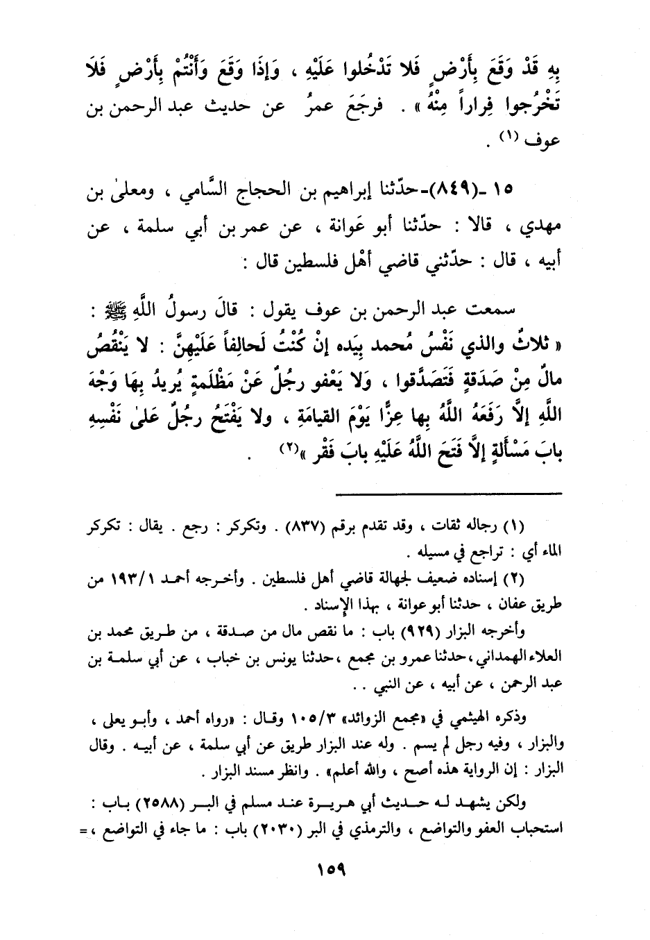 849 - حَدَّثَنَا إِبْرَاهِيمُ بْنُ الْحَجَّاجِ السَّامِيُّ، وَمُعَلَّى بْنُ مَهْدِيٍّ، قَالَا: حَدَّثَنَا أَبُو عَوَانَةَ، عَنْ عُمَرَ بْنِ أَبِي سَلَمَةَ، عَنْ أَبِيهِ قَالَ: حَدَّثَنِي قَاضِي أَهْلِ فِلَسْطِينَ قَالَ: سَمِعْتُ عَبْدَ الرَّحْمَنِ بْنَ عَوْفٍ يَقُولُ: قَالَ رَسُولُ اللَّهِ صَلَّى اللهُ عَلَيْهِ وَسَلَّمَ: " ثَلَاثٌ وَالَّذِي نَفْسُ مُحَمَّدٍ بِيَدِهِ إِنْ كُنْتُ لَحَالِفًا عَلَيْهِنَّ: §لَا يَنْقُصُ مَالٌ مِنْ صَدَقَةٍ فَتَصَدَّقُوا، وَلَا يَعْفُو رَجُلٌ عَنْ مَظْلِمَةٍ يُرِيدُ بِهَا وَجْهَ اللَّهِ إِلَّا رَفَعَهُ اللَّهُ بِهَا عِزًّا يَوْمَ الْقِيَامَةِ، وَلَا يَفْتَحُ رَجُلٌ عَلَى نَفْسِهِ بَابَ مَسْأَلَةٍ إِلَّا فَتَحَ اللَّهُ عَلَيْهِ بَابَ فَقْرٍ " -[160]-، حَدَّثَنَا زُهَيْرُ بْنُ حَرْبٍ، حَدَّثَنَا هِشَامُ بْنُ عَبْدِ الْمَلِكِ، حَدَّثَنَا أَبُو عَوَانَةَ، عَنْ عُمَرَ بْنِ أَبِي سَلَمَةَ، عَنْ أَبِيهِ، عَنْ قَاضِي أَهْلِ فِلَسْطِينَ، عَنْ عَبْدِ الرَّحْمَنِ بْنِ عَوْفٍ قَالَ: قَالَ رَسُولُ اللَّهِ صَلَّى اللهُ عَلَيْهِ وَسَلَّمَ، فَذَكَرَ نَحْوَهُKإسناده ضعيف