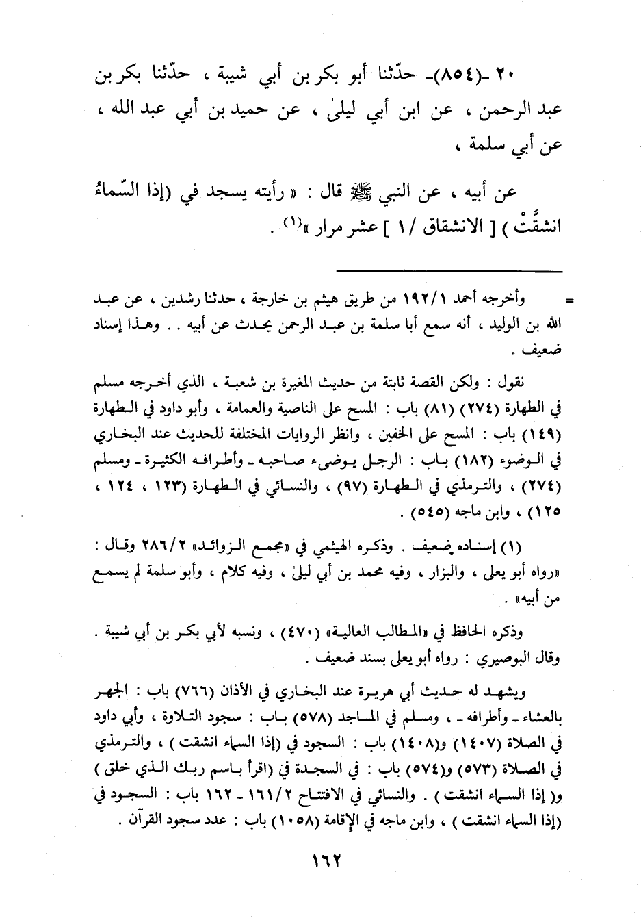 854 - حَدَّثَنَا أَبُو بَكْرِ بْنِ أَبِي شَيْبَةَ، حَدَّثَنَا بَكْرُ بْنُ عَبْدِ الرَّحْمَنِ، عَنِ ابْنِ أَبِي لَيْلَى، عَنْ حُمَيْدِ بْنِ أَبِي عَبْدِ اللَّهِ، عَنْ أَبِي سَلَمَةَ، عَنْ أَبِيهِ، عَنِ النَّبِيِّ صَلَّى اللهُ عَلَيْهِ وَسَلَّمَ قَالَ: " رَأَيْتُهُ §يَسْجُدُ فِي {إِذَا السَّمَاءُ انْشَقَّتْ} [الانشقاق: 1] عَشْرَ مِرَارٍ "Kإسناده ضعيف
