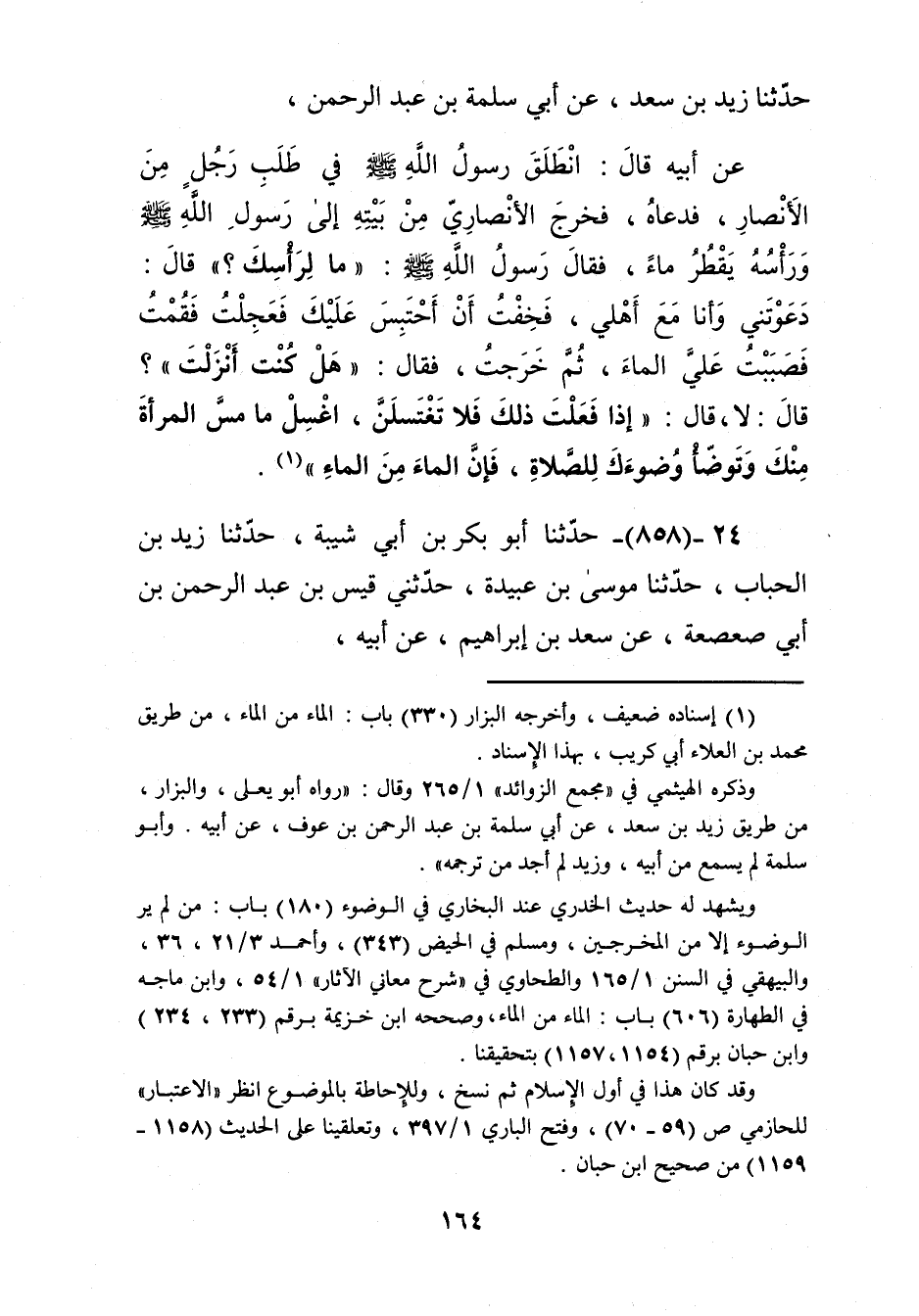 858 - حَدَّثَنَا أَبُو بَكْرِ بْنِ أَبِي شَيْبَةَ، حَدَّثَنَا زَيْدُ بْنُ الْحُبَابِ، حَدَّثَنَا مُوسَى بْنُ عُبَيْدَةَ، حَدَّثَنِي قَيْسُ بْنَ عَبْدِ الرَّحْمَنِ بْنِ أَبِي صَعْصَعَةَ، عَنْ سَعْدِ بْنِ إِبْرَاهِيمَ، عَنْ أَبِيهِ، عَنْ جَدِّهِ عَبْدِ الرَّحْمَنِ قَالَ: كَانَ لَا يُفَارِقُ رَسُولَ اللَّهِ صَلَّى اللهُ عَلَيْهِ وَسَلَّمَ مِنَّا خَمْسَةٌ أَوْ أَرْبَعَةٌ مِنْ أَصْحَابِ النَّبِيِّ صَلَّى اللهُ عَلَيْهِ وَسَلَّمَ لِمَا يَنُوبُهُ مِنْ حَوَائِجِهِ بِاللَّيْلِ وَالنَّهَارِ، قَالَ: فَجِئْتُهُ وَقَدْ خَرَجَ، فَاتَّبَعَتْهُ فَدَخَلَ حَائِطًا مِنْ حِيطَانِ الْأَسْوَافِ، فَصَلَّى فَسَجَدَ فَأَطَالَ السُّجُودَ، وَقُلْتُ: قَبَضَ اللَّهُ رُوحَهُ، قَالَ: فَرَفَعَ رَأْسَهُ فَدَعَانِي، فَقَالَ: «مَا لِكَ؟»، فَقُلْتُ: يَا رَسُولَ اللَّهِ، أَطَلْتَ السُّجُودَ قُلْتُ: قَبَضَ اللَّهُ رَوْحَ رَسُولِهِ لَا أَرَاهُ أَبَدًا، قَالَ: «§سَجَدْتُ شُكْرًا لِرَبِّي فِيمَا أَبْلَانِي فِي أُمَّتِي، مَنْ صَلَّى عَلَيَّ صَلَاةً مِنْ أُمَّتِي كُتِبَ لَهُ عَشْرُ حَسَنَاتٍ وَمُحِيَ عَنْهُ عَشْرُ سَيِّئَاتٍ» Kإسناده ضعيف