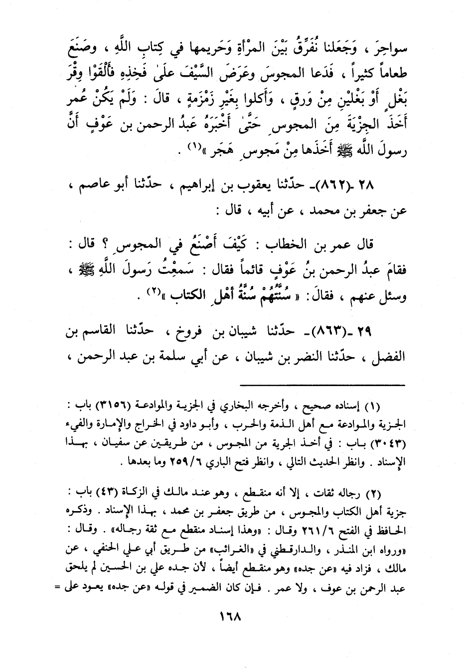 862 - حَدَّثَنَا يَعْقُوبُ بْنُ إِبْرَاهِيمَ، حَدَّثَنَا أَبُو عَاصِمٍ، عَنْ جَعْفَرِ بْنِ مُحَمَّدٍ، عَنْ أَبِيهِ قَالَ: قَالَ عُمَرُ بْنُ الْخَطَّابِ: كَيْفَ أَصْنَعُ فِي الْمَجُوسِ؟ قَالَ: فَقَامَ عَبْدُ الرَّحْمَنِ بْنُ عَوْفٍ قَائِمًا فَقَالَ: سَمِعْتُ رَسُولَ اللَّهِ صَلَّى اللهُ عَلَيْهِ وَسَلَّمَ وَسُئِلَ عَنْهُمْ فَقَالَ: «§سُنَّتُهُمْ سُنَّةُ أَهْلِ الْكِتَابِ» Kرجاله ثقات إلا أنه منقطع