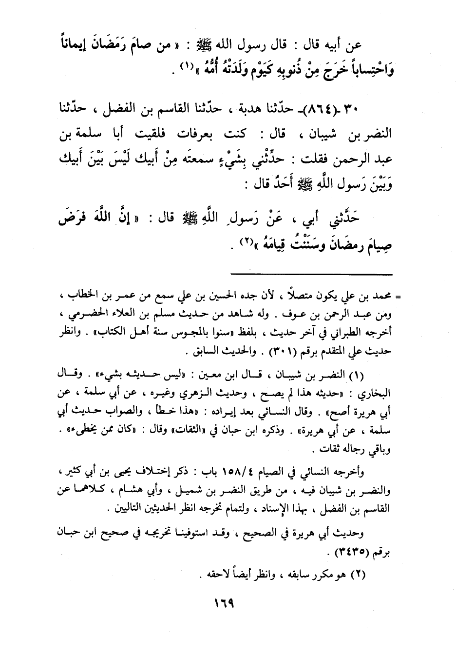 864 - حَدَّثَنَا هُدْبَةُ، حَدَّثَنَا الْقَاسِمُ بْنُ الْفَضْلِ، حَدَّثَنَا النَّضْرُ بْنُ شَيْبَانَ، قَالَ: كُنْتُ بِعَرَفَاتٍ فَلَقِيتُ أَبَا سَلَمَةَ بْنَ عَبْدِ الرَّحْمَنِ فَقُلْتُ: حَدَّثَنِي بِشَيْءٍ سَمِعْتَهُ مِنْ أَبِيكَ لَيْسَ بَيْنَ أَبِيكَ وَبَيْنَ رَسُولِ اللَّهِ صَلَّى اللهُ عَلَيْهِ وَسَلَّمَ أَحَدٌ، قَالَ: حَدَّثَنِي أَبِي، عَنْ رَسُولِ اللَّهِ صَلَّى اللهُ عَلَيْهِ وَسَلَّمَ قَالَ: «إِنَّ §اللَّهَ فَرَضَ صِيَامَ رَمَضَانَ وَسَنَنْتُ قِيَامَهُ»