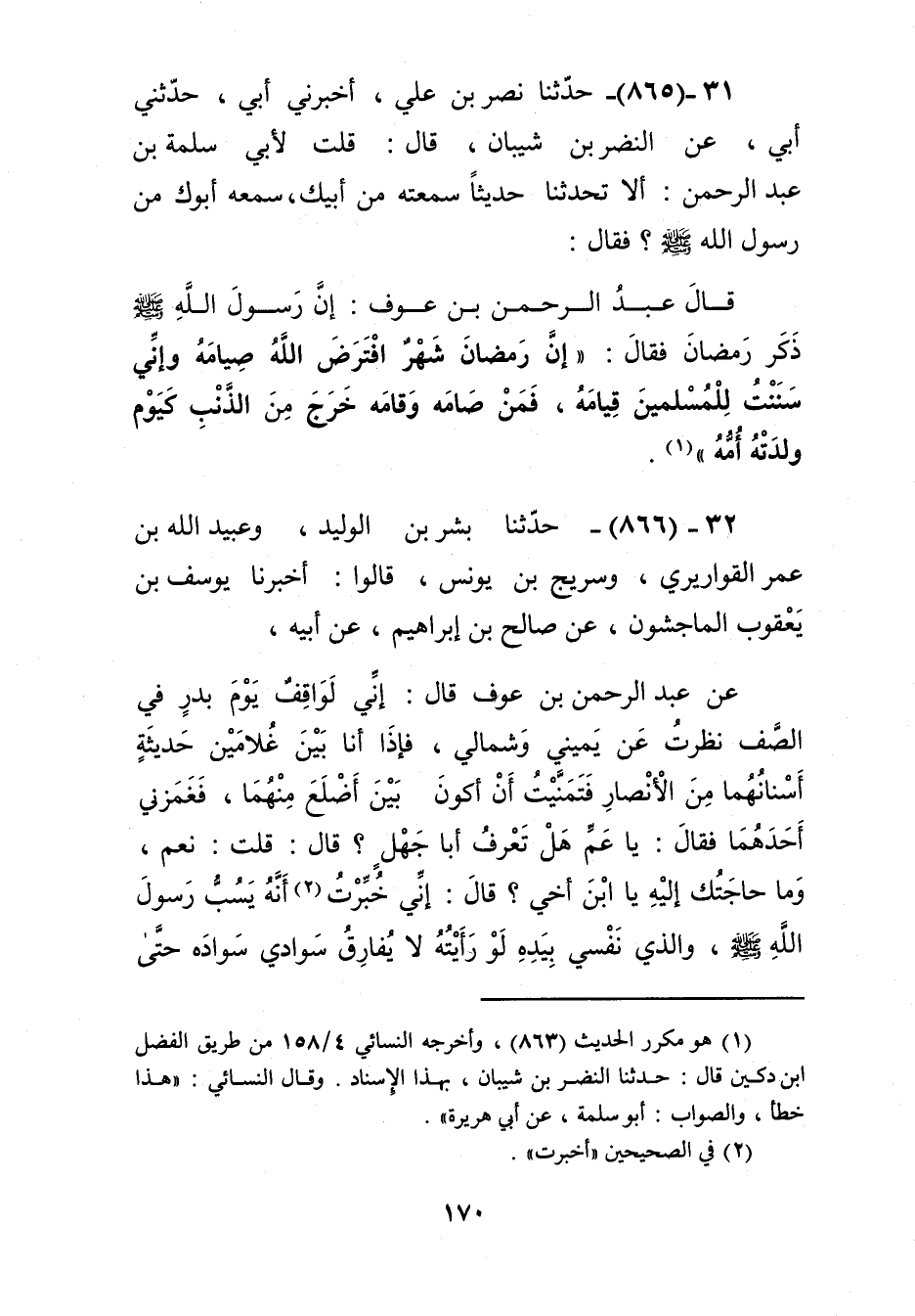 865 - حَدَّثَنَا نَصْرُ بْنُ عَلَيٍّ، أَخْبَرَنِي أَبِي، حَدَّثَنِي أَبِي، عَنِ النَّضْرِ بْنِ شَيْبَانَ قَالَ: قُلْتُ لِأَبِي سَلَمَةَ بْنِ عَبْدِ الرَّحْمَنِ: أَلَا تُحَدِّثُنَا حَدِيثًا سَمِعَتْهُ مِنْ أَبِيكَ، سَمِعَهُ أَبُوكَ مِنْ رَسُولِ اللَّهِ صَلَّى اللهُ عَلَيْهِ وَسَلَّمَ؟ فَقَالَ: قَالَ عَبْدُ الرَّحْمَنِ بْنُ عَوْفٍ: إِنَّ رَسُولَ اللَّهِ صَلَّى اللهُ عَلَيْهِ وَسَلَّمَ ذَكَرَ رَمَضَانَ فَقَالَ: «إِنَّ §رَمَضَانَ شَهْرٌ افْتَرَضَ اللَّهُ صِيَامَهُ، وَإِنِّي سَنَنْتُ لِلْمُسْلِمِينَ قِيَامَهُ، فَمَنْ صَامَهُ وَقَامَهُ خَرَجَ مِنَ الذَّنْبِ كَيَوْمِ وَلَدَتْهُ أُمُّهُ»