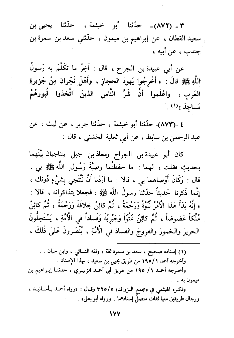 872 - حَدَّثَنَا أَبُو خَيْثَمَةَ، حَدَّثَنَا يَحْيَى بْنُ سَعِيدٍ الْقَطَّانُ، عَنْ إِبْرَاهِيمَ بْنِ مَيْمُونٍ، حَدَّثَنِي سَعْدُ بْنُ سَمُرَةَ بْنِ جُنْدُبٍ، عَنْ أَبِيهِ، عَنْ أَبِي عُبَيْدَةَ بْنِ الْجَرَّاحِ قَالَ: آخِرُ مَا تَكَلَّمَ بِهِ رَسُولُ اللَّهِ صَلَّى اللهُ عَلَيْهِ وَسَلَّمَ قَالَ: «§أَخْرِجُوا يَهُودَ الْحِجَازِ وَأَهْلَ نَجْرَانَ مِنْ جَزِيرَةِ الْعَرَبِ، وَاعْلَمُوا أَنَّ شَرَّ النَّاسِ الَّذِينَ اتَّخَذُوا قُبُورَهُمْ مَسَاجِدَ» Kإسناده صحيح