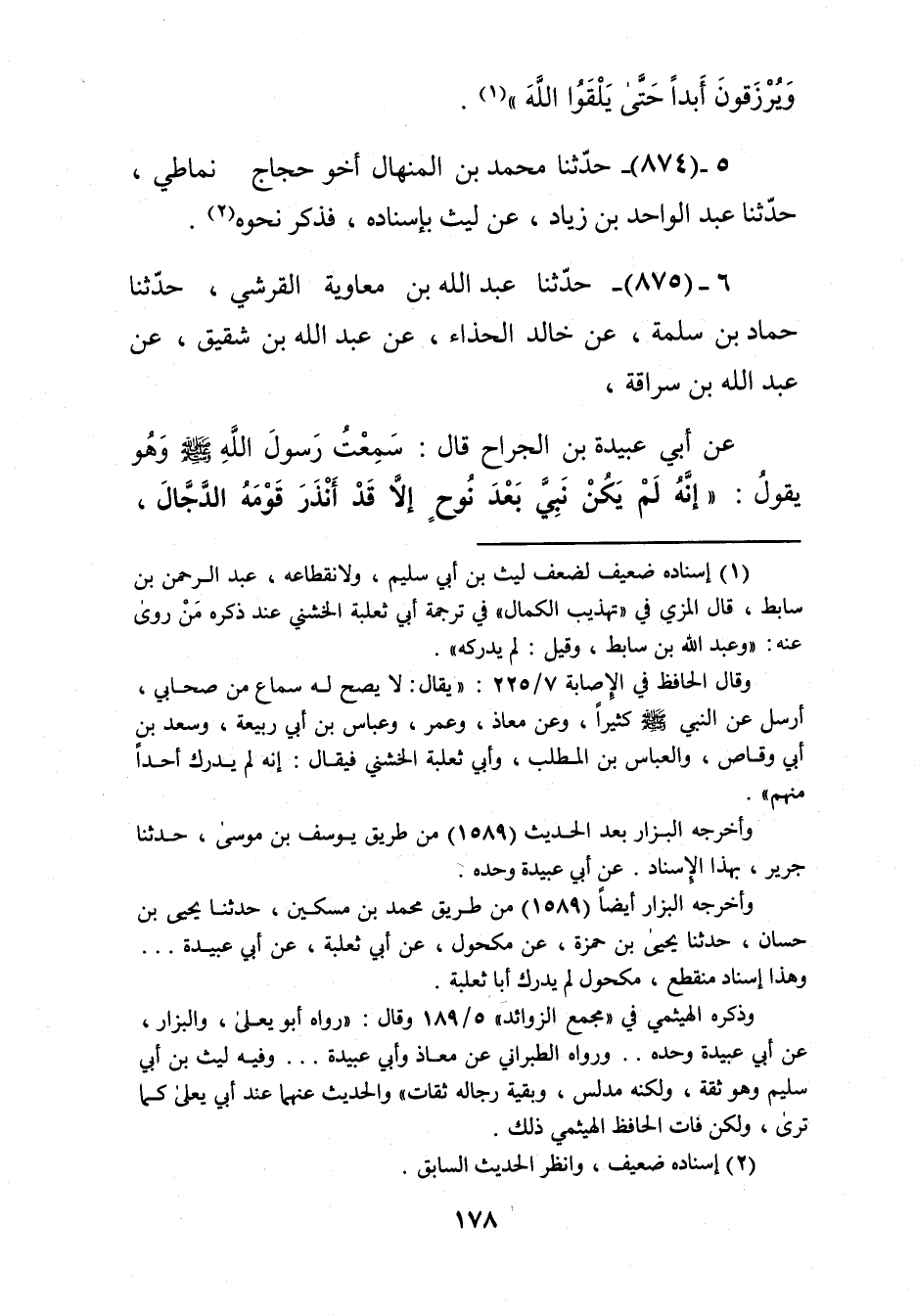 875 - حَدَّثَنَا عَبْدُ اللَّهِ بْنُ مُعَاوِيَةَ الْقُرَشِيُّ، حَدَّثَنَا حَمَّادُ بْنُ سَلَمَةَ، عَنْ خَالِدِ الْحَذَّاءِ، عَنْ عَبْدِ اللَّهِ بْنِ شَقِيقٍ، عَنْ عَبْدِ اللَّهِ بْنِ سُرَاقَةَ، عَنْ أَبِي عُبَيْدَةَ بْنِ الْجَرَّاحِ قَالَ: سَمِعْتُ رَسُولَ اللَّهِ صَلَّى اللهُ عَلَيْهِ وَسَلَّمَ وَهُوَ يَقُولُ: «إِنَّهُ §لَمْ يَكُنْ نَبِيٌّ بَعْدَ نُوحٍ إِلَّا قَدْ أَنْذَرَ قَوْمَهُ الدَّجَّالَ، وَإِنِّي أُنْذِرُكُمُوهُ»، فَوَصَفَهُ لَنَا رَسُولُ اللَّهِ صَلَّى اللهُ عَلَيْهِ وَسَلَّمَ وَقَالَ: «لَعَلَّهُ سَيُدْرِكُهُ بَعْضُ مَنْ رَآنِي أَوْ سَمِعَ كَلَامِي»، قَالُوا: يَا رَسُولَ اللَّهِ، كَيْفَ قُلُوبُنَا يَوْمَئِذٍ، أَمِثْلُهَا الْيَوْمَ؟ قَالَ: «أَوْ أَخْيَرُ» Kرجاله ثقات
