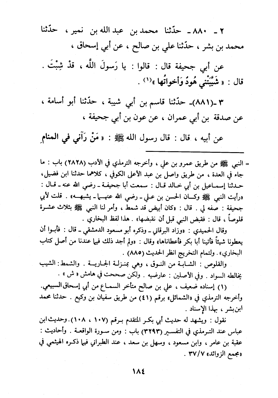 880 - حَدَّثَنَا مُحَمَّدُ بْنُ عَبْدِ اللَّهِ بْنِ نُمَيْرٍ، حَدَّثَنَا مُحَمَّدُ بْنُ بِشْرٍ، حَدَّثَنَا عَلِيُّ بْنُ صَالِحٍ، عَنْ أَبِي إِسْحَاقَ، عَنْ أَبِي جُحَيْفَةَ قَالَ: قَالُوا: يَا رَسُولَ اللَّهِ، قَدْ شِبْتَ. قَالَ: «§شَيَّبَتْنِي هُودٌ وَأَخَوَاتُهَا» Kإسناده ضعيف