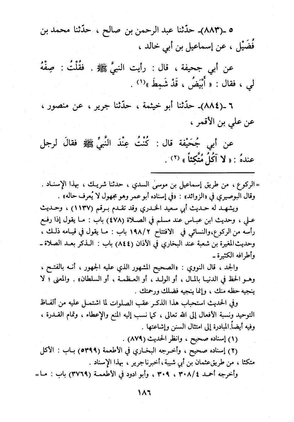 884 - حَدَّثَنَا أَبُو خَيْثَمَةَ، حَدَّثَنَا جَرِيرٌ، عَنْ مَنْصُورٍ، عَنْ عَلِيِّ بْنِ الْأَقْمَرِ، عَنْ أَبِي جُحَيْفَةَ قَالَ: كُنْتُ عِنْدَ النَّبِيِّ صَلَّى اللهُ عَلَيْهِ وَسَلَّمَ فَقَالَ لِرَجُلٍ عِنْدَهُ: «§لَا آكُلُ مُتَّكِئًا» Kإسناده صحيح