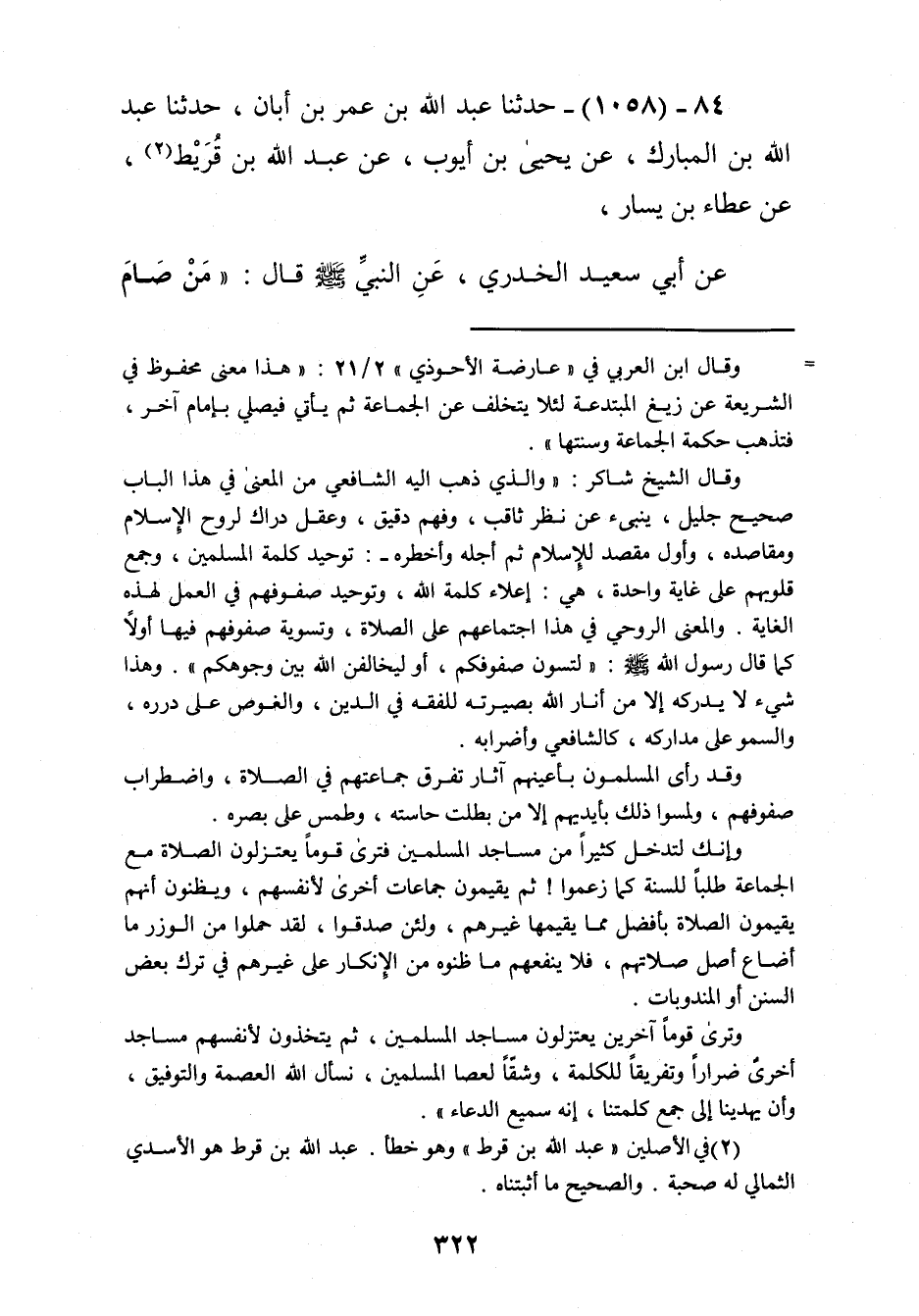 1058 - حَدَّثَنَا عَبْدُ اللَّهِ بْنُ عُمَرَ بْنِ أَبَانَ، حَدَّثَنَا عَبْدُ اللَّهِ بْنُ الْمُبَارَكِ، عَنْ يَحْيَى بْنِ أَيُّوبَ، عَنْ عَبْدِ اللَّهِ بْنِ قُرَيْطٍ، عَنْ عَطَاءِ بْنِ يَسَارٍ، عَنْ أَبِي سَعِيدٍ الْخُدْرِيِّ، عَنِ النَّبِيِّ صَلَّى اللهُ عَلَيْهِ وَسَلَّمَ قَالَ: «§مَنْ صَامَ رَمَضَانَ، فَعَرَفَ حُدُودَهُ وَحَفِظَ مَا يَنْبَغِي لَهُ أَنْ يَحْفَظَ مِنْهُ، كَفَّرَ مَا قَبْلَهُ» Kعبد الله بن قريط وثقه ابن حبان وباقي رجاله ثقات