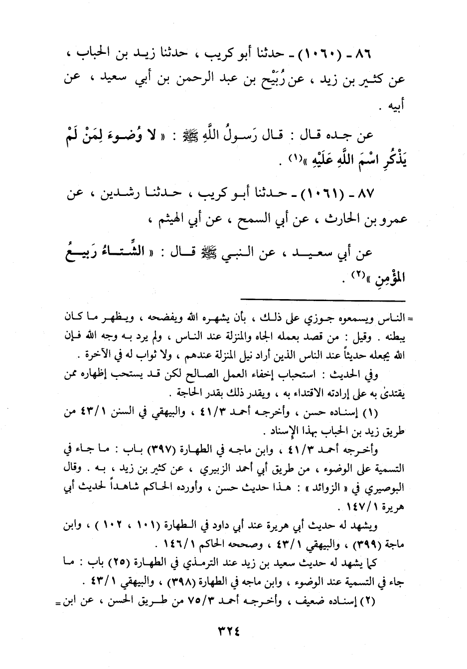 1060 - حَدَّثَنَا أَبُو كُرَيْبٍ، حَدَّثَنَا زَيْدُ بْنُ الْحُبَابِ، عَنْ كَثِيرِ بْنِ زَيْدٍ، عَنْ رُبَيْحِ بْنِ عَبْدِ الرَّحْمَنِ بْنِ أَبِي سَعِيدٍ، عَنْ أَبِيهِ، عَنْ جَدِّهِ قَالَ: قَالَ رَسُولُ اللَّهِ صَلَّى اللهُ عَلَيْهِ وَسَلَّمَ: «§لَا وَضُوءَ لِمَنْ لَمْ يَذْكُرِ اسْمَ اللَّهِ عَلَيْهِ» Kإسناده حسن