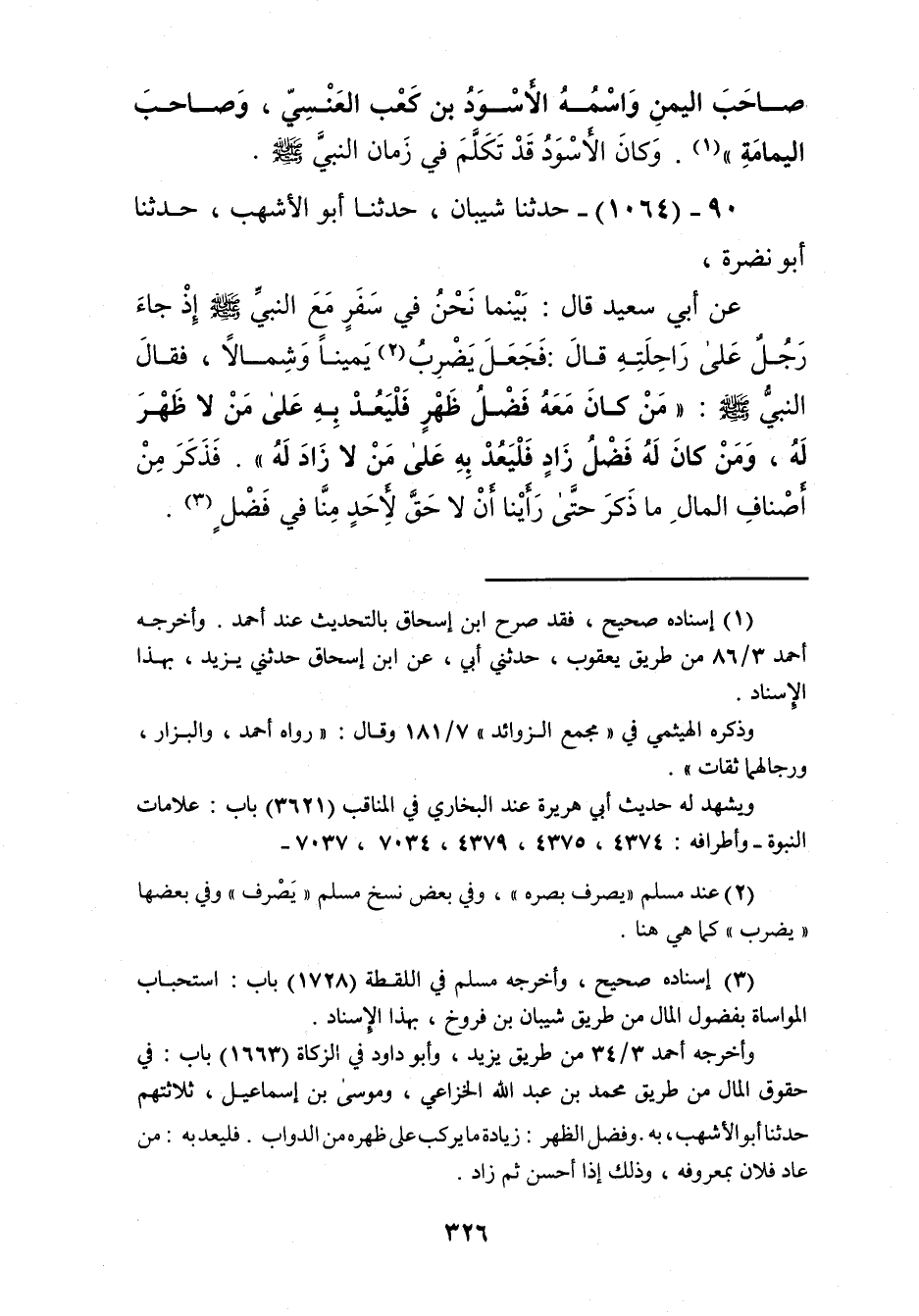 1064 - حَدَّثَنَا شَيْبَانُ، حَدَّثَنَا أَبُو الْأَشْهَبِ، حَدَّثَنَا أَبُو نَضْرَةَ، عَنْ أَبِي سَعِيدٍ قَالَ: بَيْنَمَا نَحْنُ فِي سَفَرٍ مَعَ النَّبِيِّ صَلَّى اللهُ عَلَيْهِ وَسَلَّمَ إِذْ جَاءَ رَجُلٌ عَلَى رَاحِلَتِهِ قَالَ: فَجَعَلَ يَضْرِبُ يَمِينًا وَشِمَالًا، فَقَالَ النَّبِيُّ صَلَّى اللهُ عَلَيْهِ وَسَلَّمَ: «§مَنْ كَانَ مَعَهُ فَضْلُ ظَهْرٍ فَلْيَعُدْ بِهِ عَلَى مَنْ لَا ظَهْرَ لَهُ، وَمَنْ كَانَ لَهُ فَضْلُ زَادٍ فَلْيَعُدْ بِهِ عَلَى مَنْ لَا زَادَ لَهُ»، فَذَكَرَ مِنْ أَصْنَافِ الْمَالِ مَا ذَكَرَ حَتَّى رَأَيْنَا أَنْ لَا حَقَّ لِأَحَدٍ مِنَّا فِي فَضْلٍKإسناده صحيح